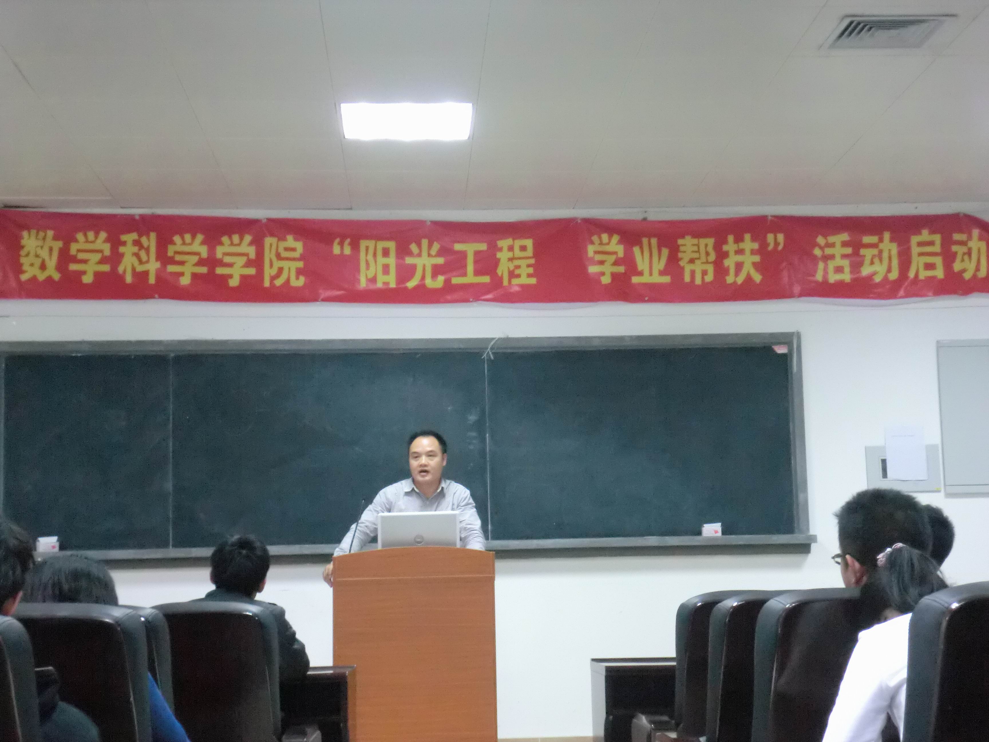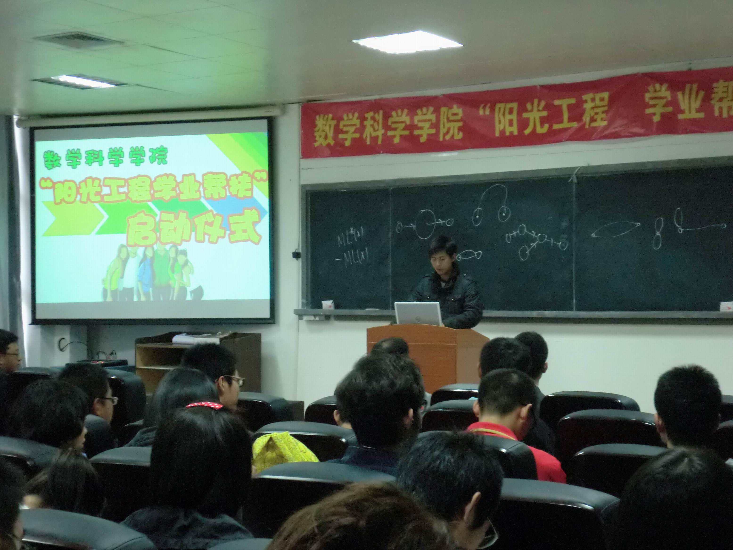 9001cc金沙“阳光工程,学业帮扶”活动是学院“阳光工程”系列活动之一,主要由两个部分组成:一是面向全校的数学答疑活动,由学院青年志愿者协会负责组织志愿者,每周二、周三晚上在公寓306教室开展数学答疑活动;二是针对学院学习困难同学的“一帮一”帮扶活动,由学院学习部负责组织学习优秀的同学为甲方,学习困难同学为乙方,双方签订学习协议,共同制定学习计划,“一帮一”一起学习,共同进步。