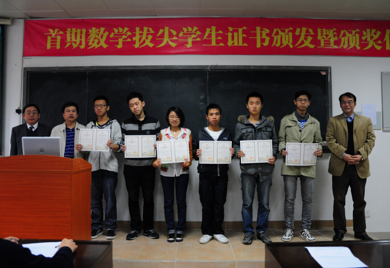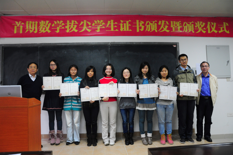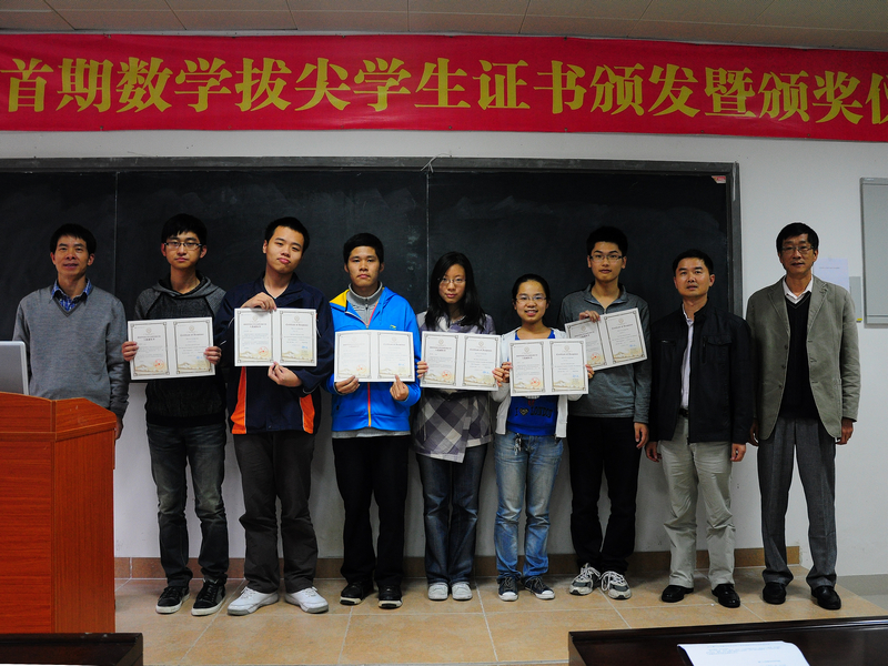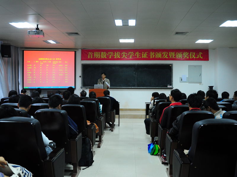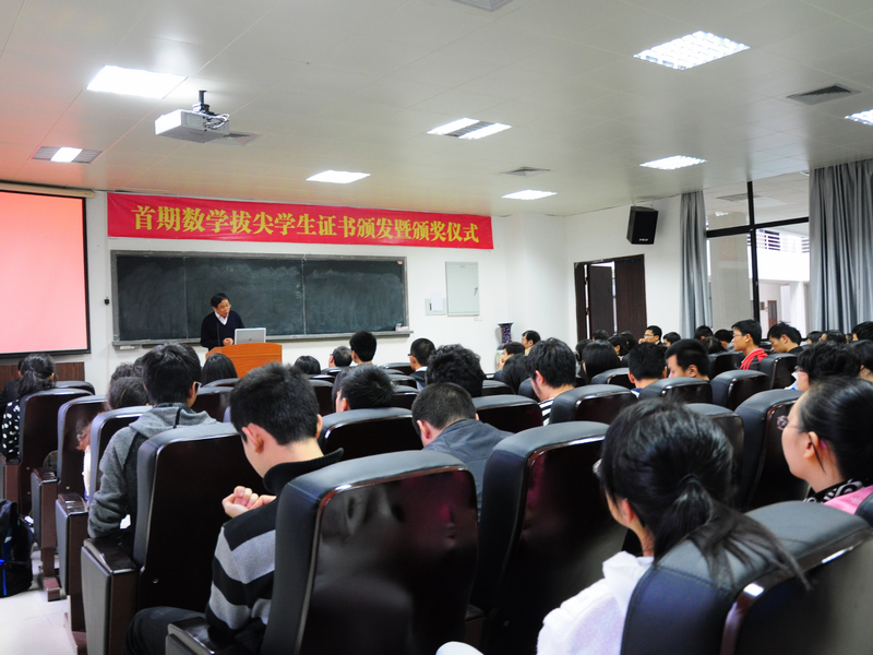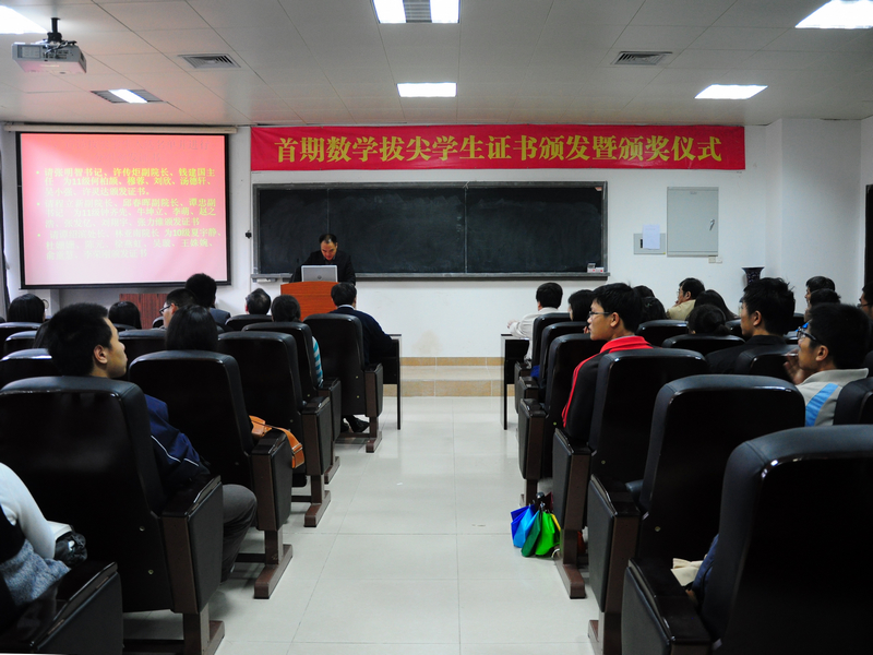 2012年11月29日下午,9001cc金沙在海韵实验楼105教室举行了首期数学拔尖学生证书颁发暨颁奖仪式。出席大会的有校教务处处长谭绍滨教授、9001cc金沙林亚南院长、张明智书记、程立新副院长、谭忠副书记、邱春晖副院长、许传炬副院长、郑诚明副书记、数学与应用数学系主任钱建国教授、团委副书记陈向柳老师、辅导员石义凯老师以及10、11级拔尖班全体同学,10、11级各班班委,11级基地班全体同学。大会由院党委副书记郑诚明老师主持。