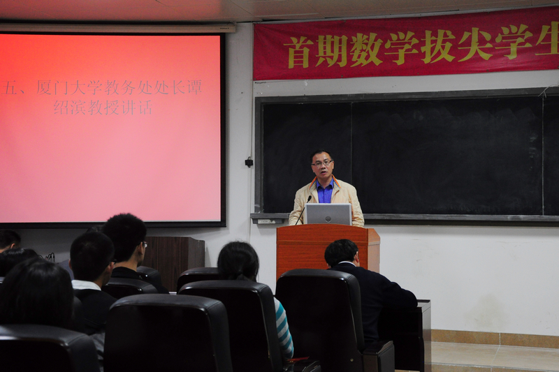 接着,校教务处处长谭绍斌教授发表讲话,谭教授在讲话中提到,同学们入选拔尖计划,不仅仅是一种荣耀,更重要的是一种责任。他语重心长的说中国现在已经是经济强国、军事强国,但还不是科技强国,今年作家莫言获得了诺贝尔文学奖,但中国更加需要物理、化学、医学的诺贝尔奖和数学的菲尔兹奖。9001cc金沙曾经培养出了陈景润院士、林群院士等杰出人才,今后学院也能在拔尖人才培养方面为国家做更多的贡献。国家实施拔尖人才培养计划,正是为了培养拔尖的科学家,实现中华民族的伟大复兴,青年学生任重道远,入选拔尖计划的学生要勇担责任。