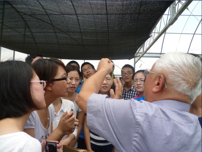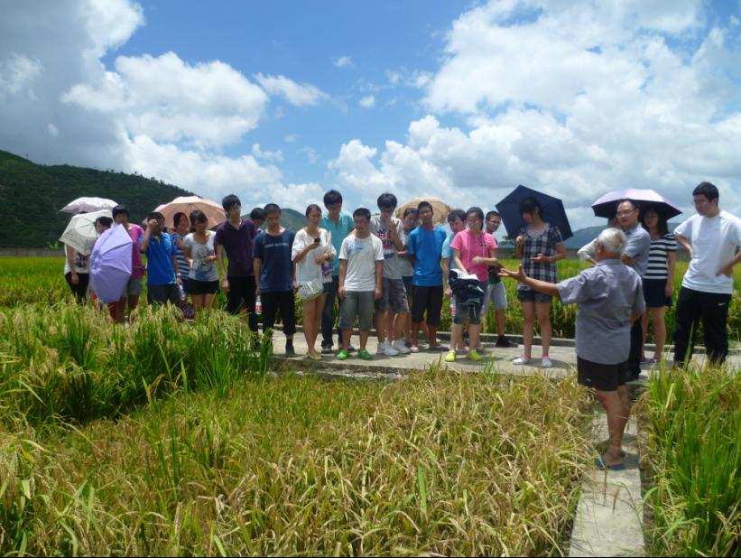 随后,我院2009届毕业生、大学生村官林彧琨带领实践队走进漳州现代农业东园示范区。在水稻研究基地,我校生命科学学院退休老教授王侯聪老师为实践队讲授了一堂生动而深刻的课程。王老教授首先将十年育一种的水稻育种研究与解决数学百年疑难做类比,道明科学研究的长期性与持续性。年逾七旬的王老教授仍旧精神矍铄,他一边带着实践队穿行在水稻实验田间,一边讲述水稻的品种与各自的优劣势,旁征博引,声境交融,他不仅让实践队了解到如今水稻种植的现状、什么是先进的水稻,还描绘了水稻种植的前景,表达了实现目标的决心。最后,王老教授道出箴言:“做一个品种不容易,吃一粒米要懂得珍惜”,并以自身科学研究的艰苦条件寄语实践队:“暂时的困难都不重要,找到喜欢的事情就要坚持下去”。临行前,王老热情的邀请大家常来看看,并呼吁更多的人投身科学事业,鼓励全体数学人为社会做更多贡献。