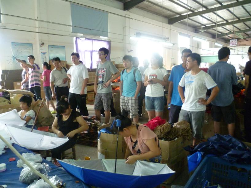 7月7日早晨8:30,实践队来到位于龙海东园镇的泰宇阳伞有限公司。在参观了成品陈列室之后,实践队进入生产车间浏览阳伞组合生产流程。炎热的车间里,工人们娴熟地工作着,从裁剪到印刷,再由合片到安装伞珠,各司其职,有条不紊。