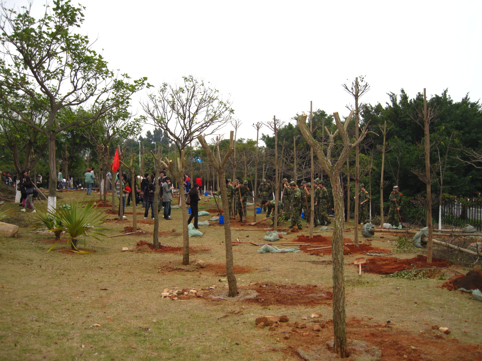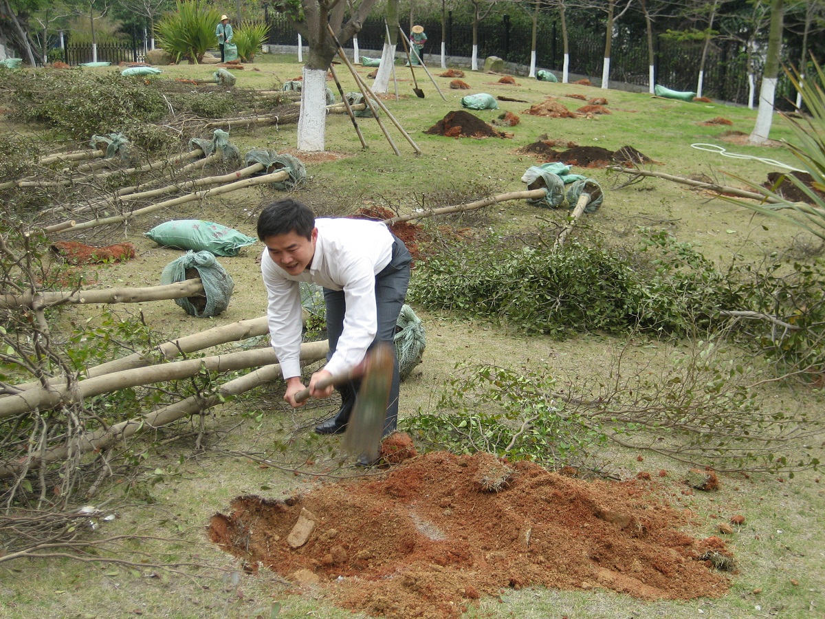 上午9点30分,我院参与本次活动的所有同学在海韵教学区门前集合完毕,并被统一带到海韵教学区大草坪处。进行了分组之后,各组同学们便领着分发的工具,来到事先确定的植树地点。参与活动的同学们分工明确,先用锄头和铲子挖出大小合适的坑,再将树苗扶入坑内,之后拌肥、填土、浇水,井井有条。活动中,张明智书记与陈向柳老师也一展身手,与同学们一起领略了劳动的艰辛和快乐。在所有参与者的通力合作和互相帮助下,一个半小时后,本次植树活动圆满结束。