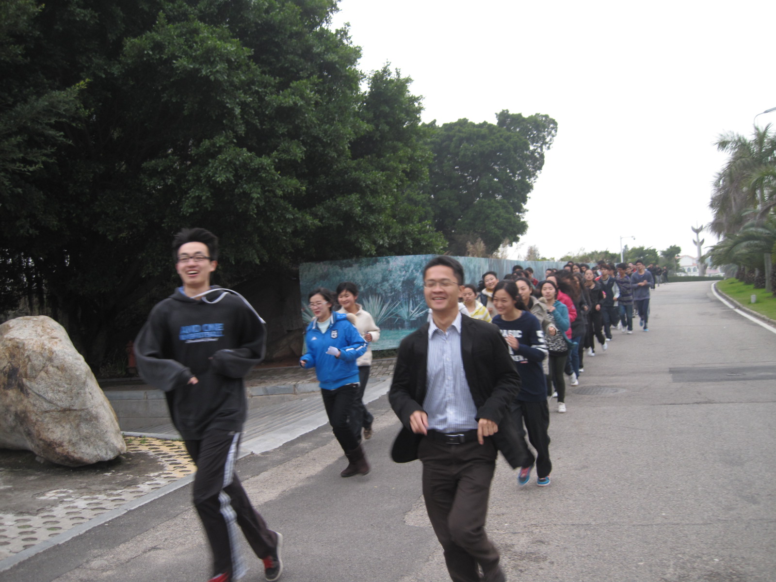 随后,学院学生会体育部部长王志雄简要介绍该计划的具体内容和实施措施,鼓励同学们选择自己喜欢的体育运动项目,并承诺学院将提供运动所需器材。合影留念之后,在郑副书记和陈老师的带领下,到场同学井然有序地沿环岛路慢跑半小时后全体同学自由运动。至此,我院“阳光工程,健身计划”正式启动实施。