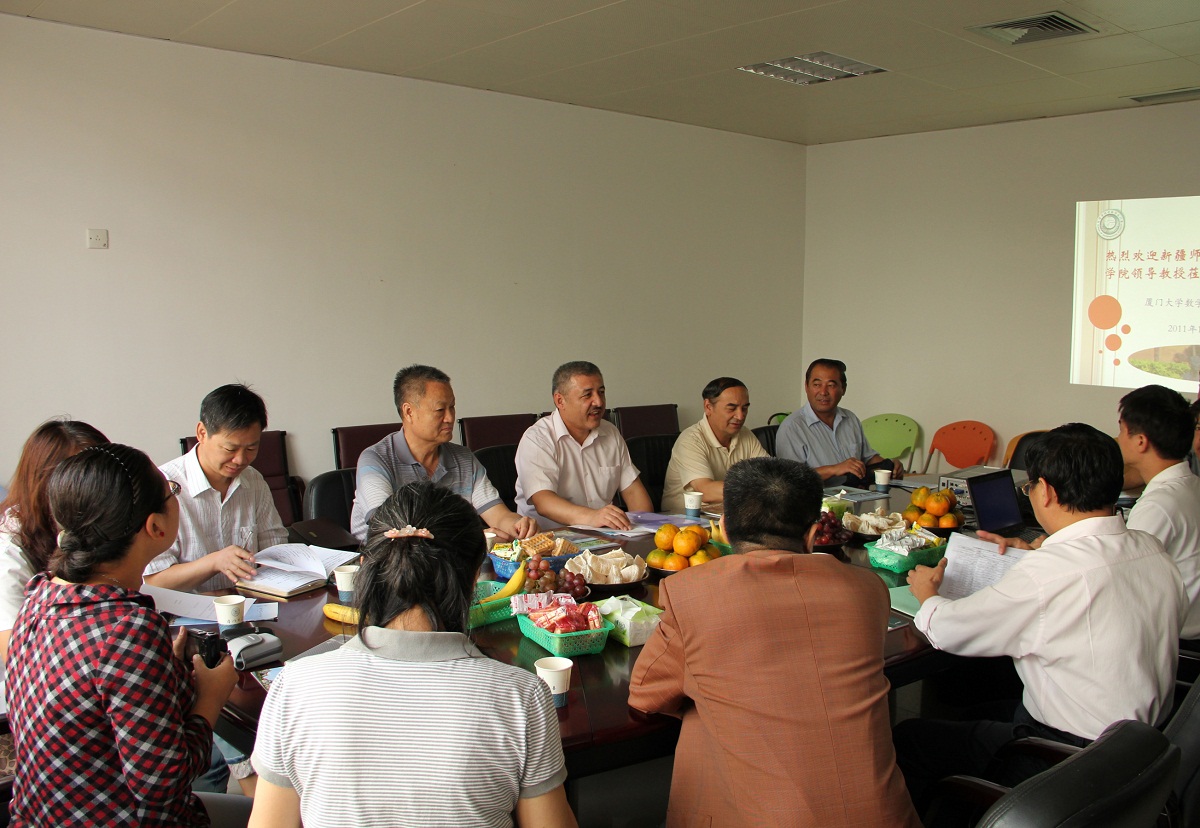 访问团一行到达我校后马上深入到漳州校区听上课、座谈,了解人才培养情况。11月1日,双方在9001cc金沙会议室举行座谈。学院党委书记张明智主持座谈会。学院院长林亚南致欢迎辞,对访问团的到来表示热烈的欢迎。副院长邱春晖介绍了学院教学和人才培养的基本情况和一系列做法。吐尔洪江副院长简要介绍了学院的基本情况和存在的困难,盛情邀请厦大数学学院组团到新疆师范大学数学学院访问指导。