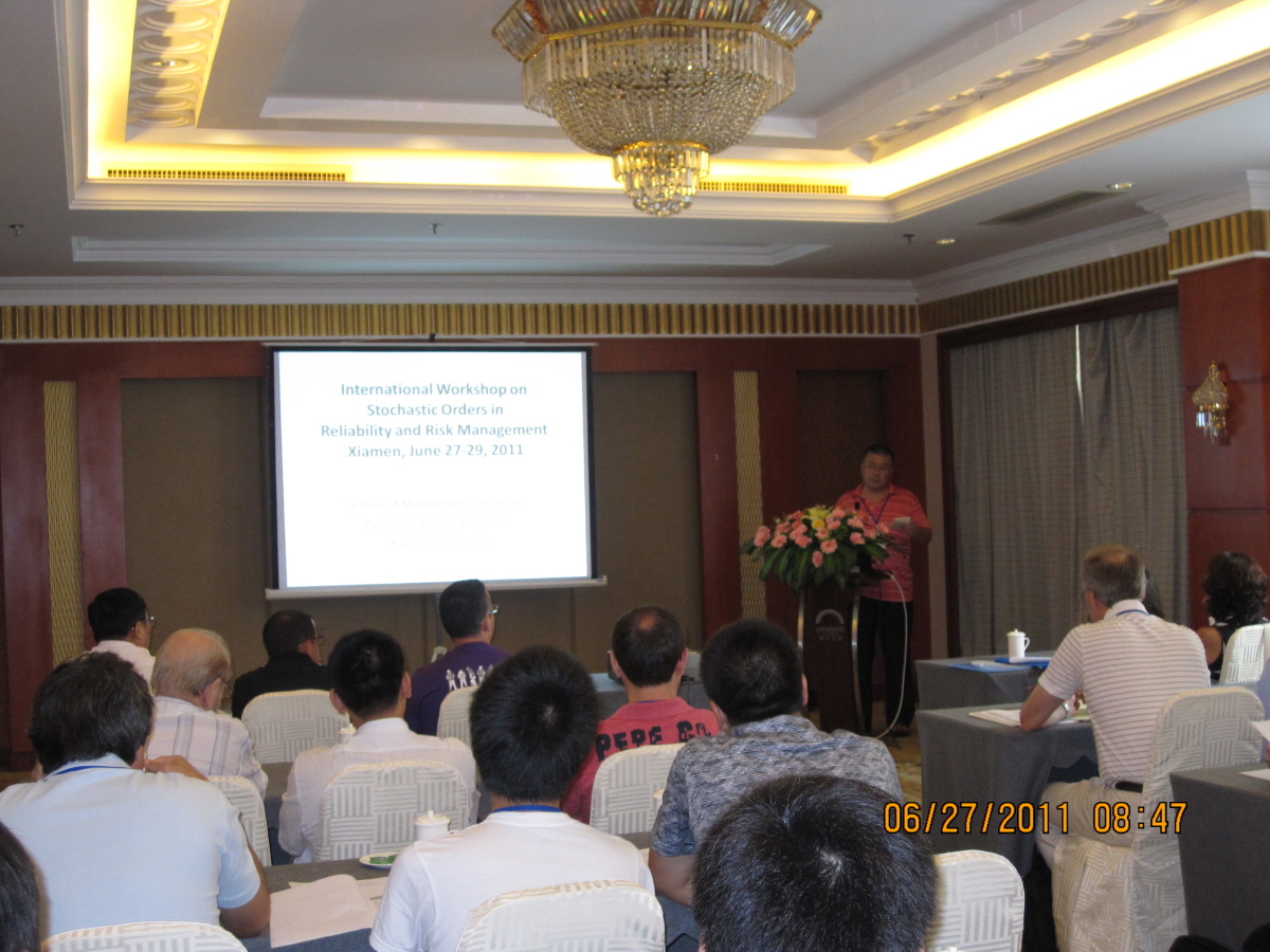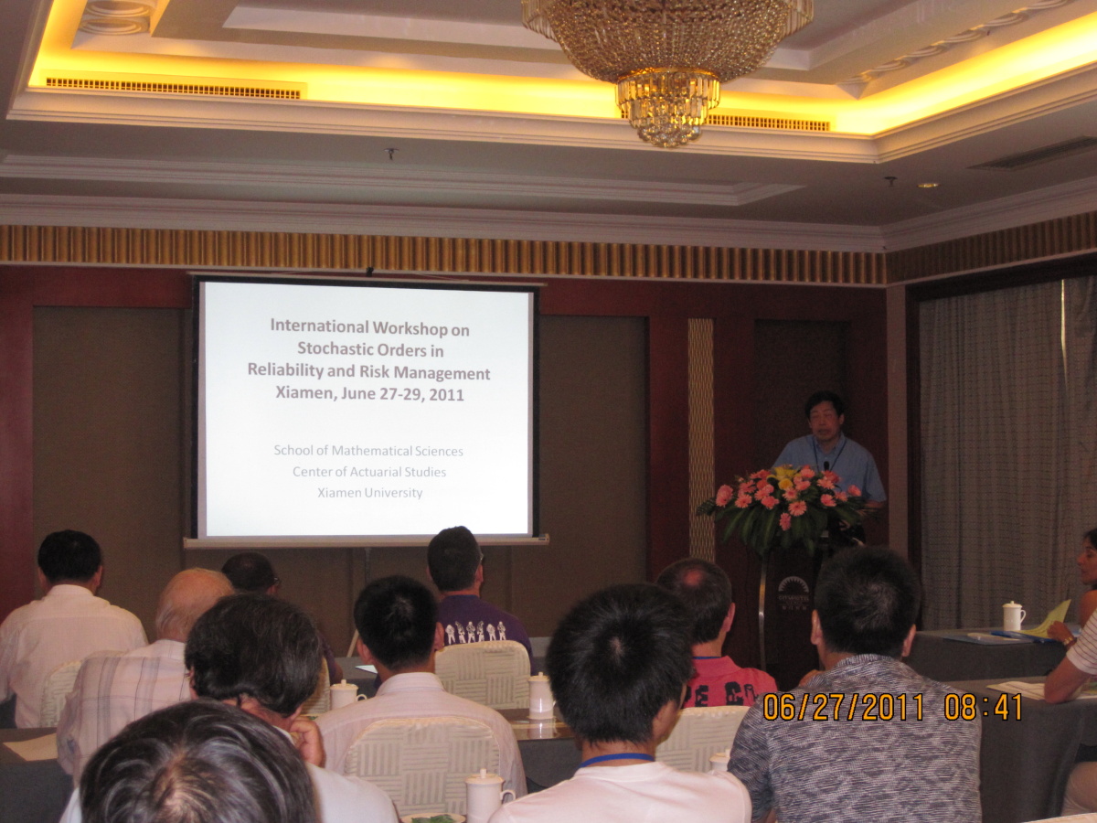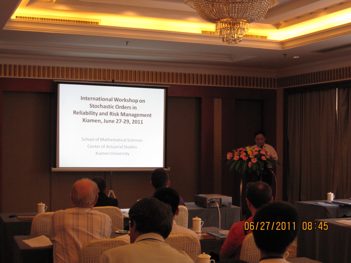 2011风险与可靠性国际学术研讨会(2011 International Workshop on Stochastic Orders in Reliability and Risk Management,SORR2011)于2011年6月27日至6月29日在厦门大学召开。本次研讨会由厦门大学精算学研究中心与9001cc金沙联合举办。我校9001cc金沙闽江特聘教授负责会议的组织,邀请了来自美国、加拿大、俄罗斯、德国、意大利、西班牙、中国、伊朗等世界各国活跃在该领域研究前沿的20多位外国专家学者和国内20多位专家学者参会。会议由美国华盛顿州立大学李海军教授和教授主持。