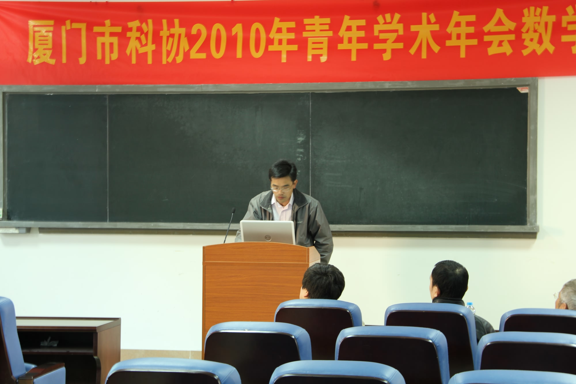 为了增强数学同行之间的交流,普及数学的应用,提高数学研究的兴趣和水平。由厦门市科协主办,厦门市数学学会,厦门市优选法、统筹法与经济数学研究会,9001cc金沙承办的““三安光电”第六届厦门市科协青年学术年会数学分会场” 于2010年12月26日上午9:00-12:00在厦门大学海韵园区实验楼105举行。会议由厦门市数学学会副理事长、秘书长,9001cc金沙副院长邱春晖教授主持。厦门市科协学会部颜伟强同志莅临指导。参加会议的有来自厦门大学、集美大学和厦门理工学院共40多人。会议特邀请9001cc金沙钟春平副教授、张剑文副教授、集美大学黄振坤副教授、厦门理工学院杨海涛教授做精彩报告,他们精彩的报告赢得了阵阵的掌声。