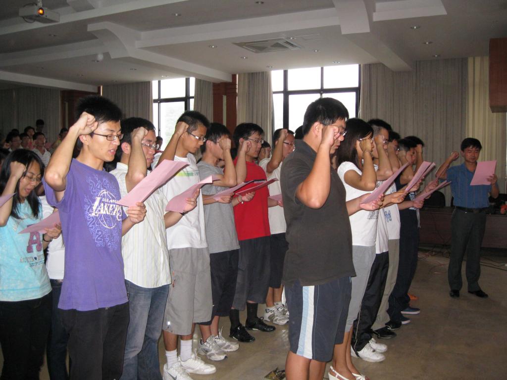 在新党员入党宣誓仪式上,过去一年加入党组织的新同志在张明智的带领下,面向鲜红党旗,高高举起右拳,庄严宣誓。