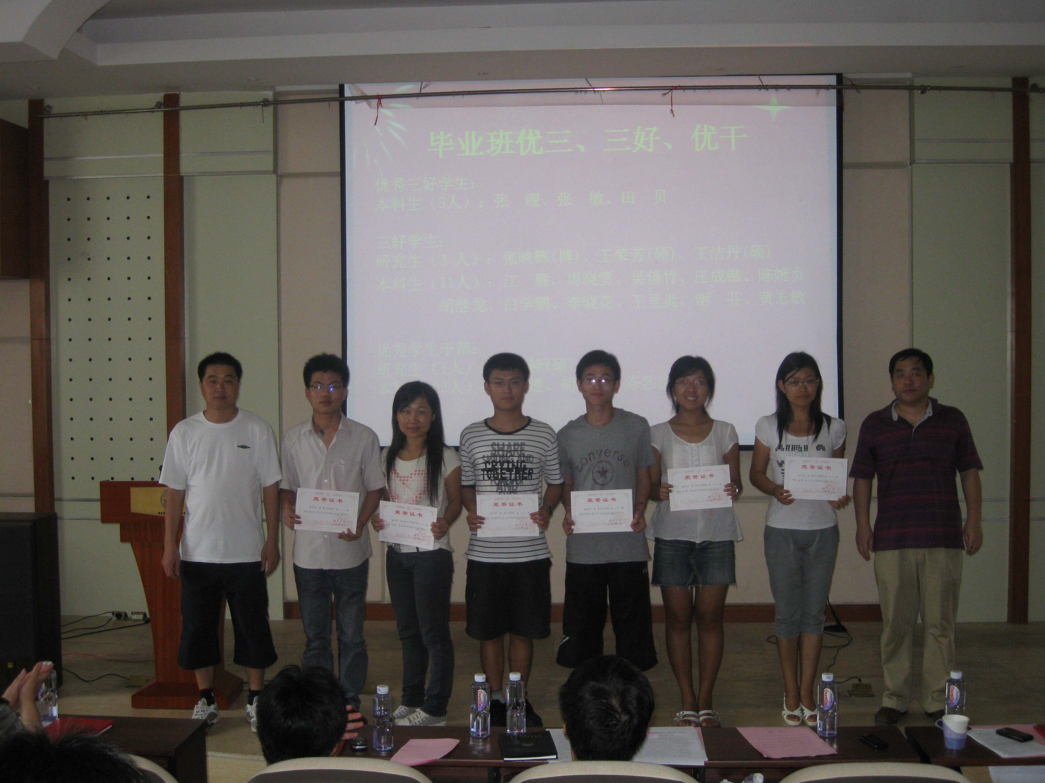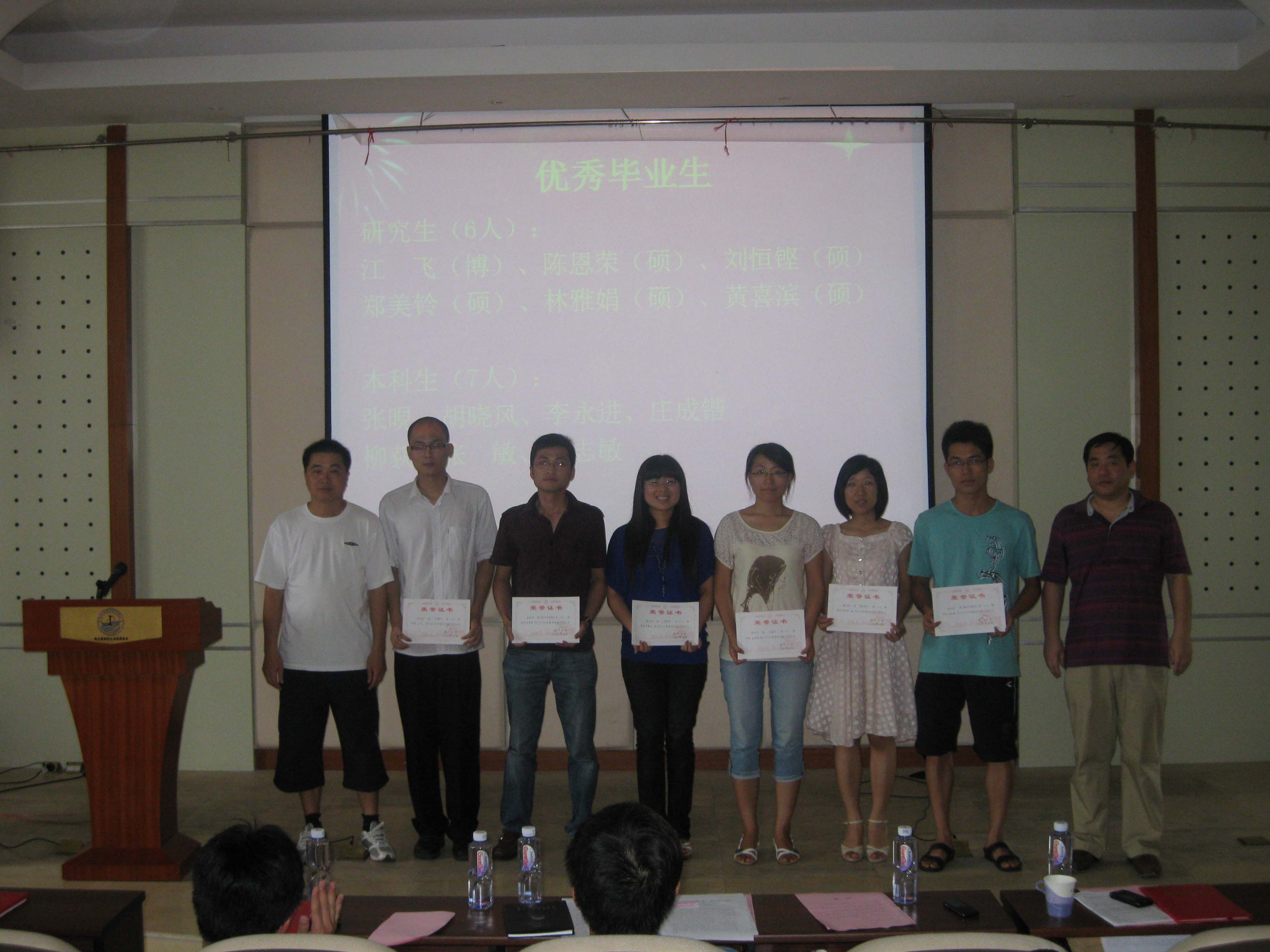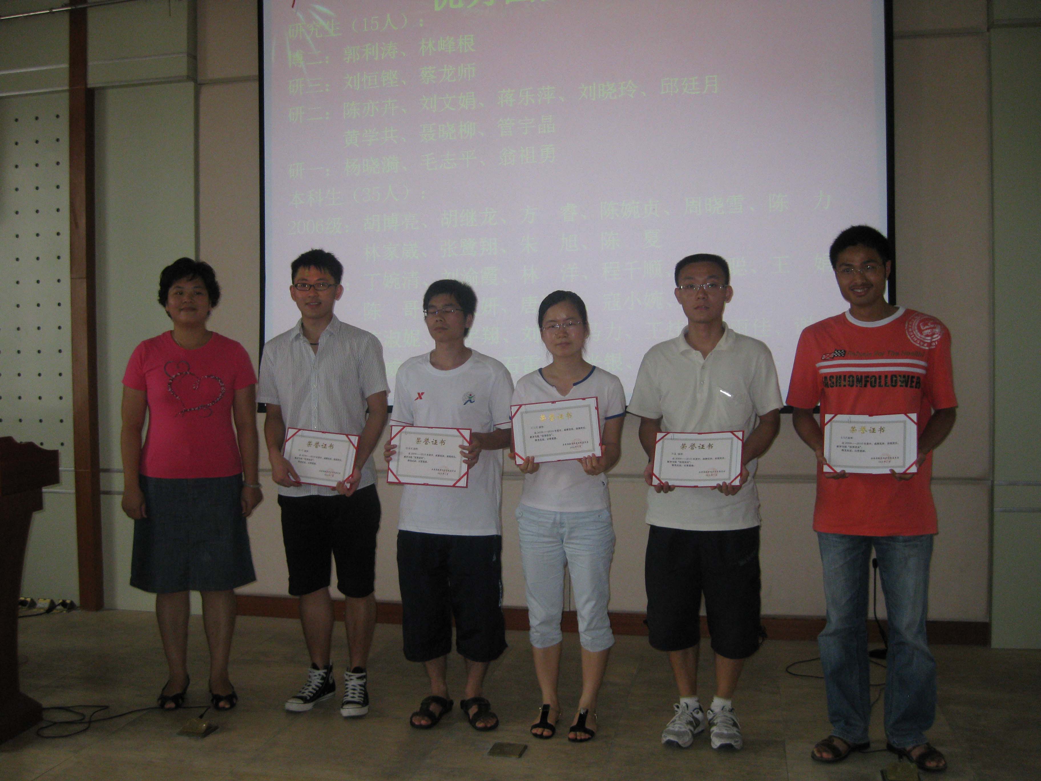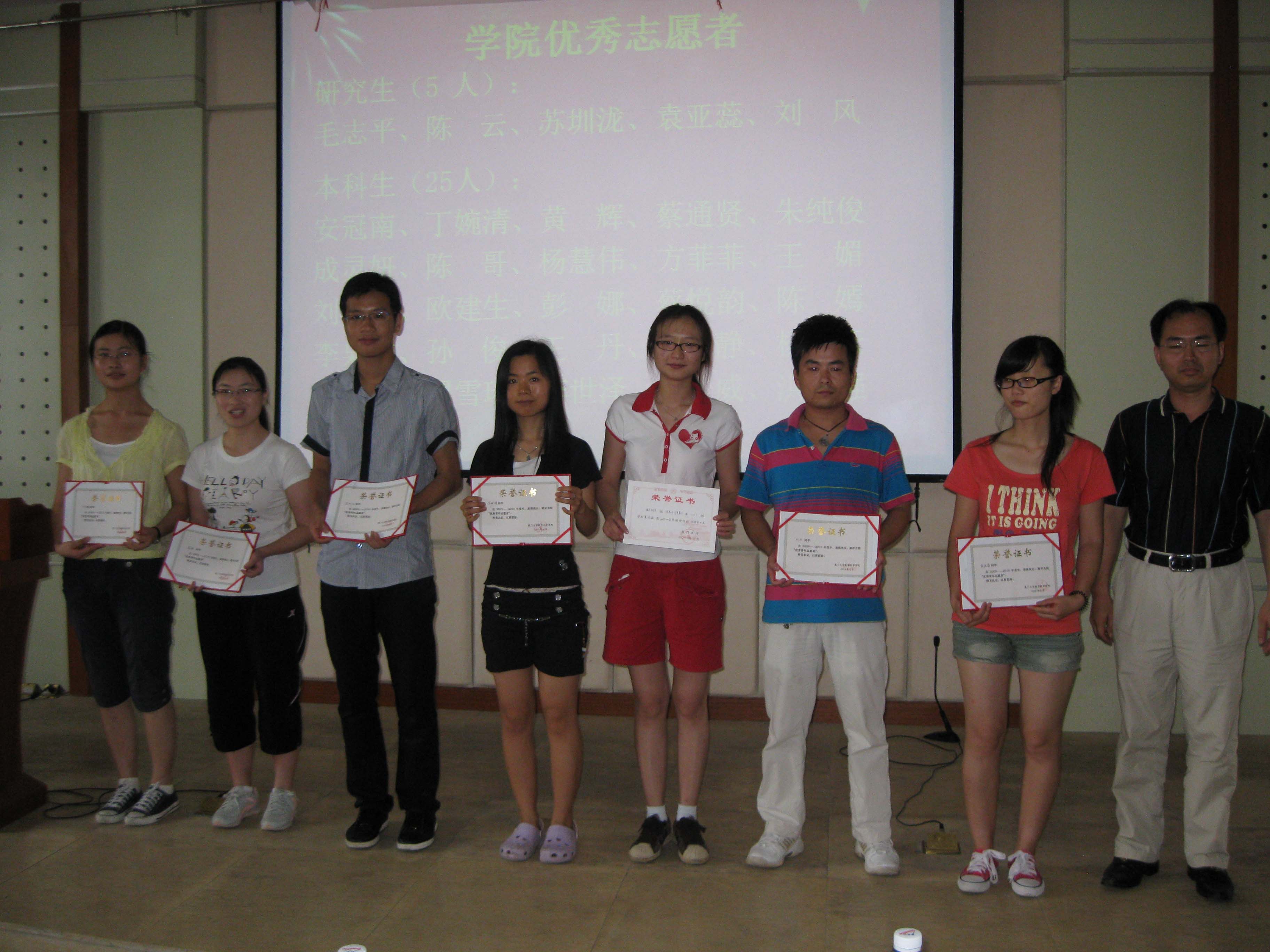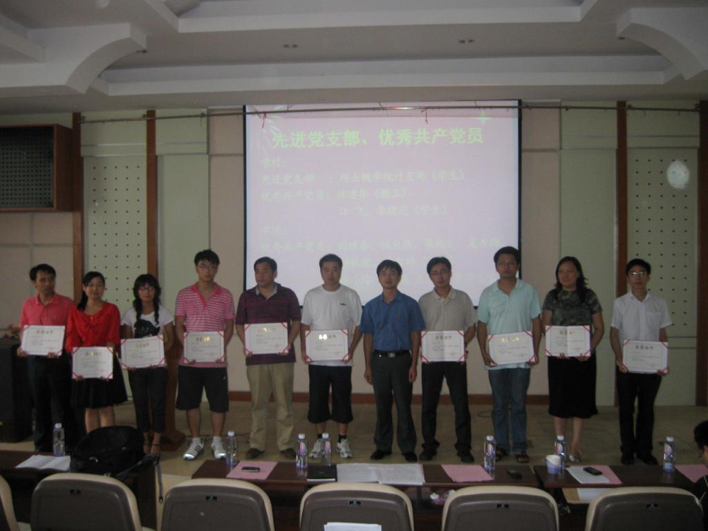 谭忠代表学院党委宣读《关于表彰2009—2010学年优秀共产党员的决定》,刘继春、伍火熊、张剑文、吴杏梅、杨机像、林智雄、张小玲、管宇晶、王华桥、李洋等10名同志被授予2009—2010学年学院“优秀共产党员”光荣称号。此外,本次大会还为在毕业生评奖评优中获得优秀毕业生、优秀三好学生、三好学生、优秀学生干部,在五四评优中获得校、院表彰的先进团支部、优秀团支部书记、优秀团员,以及获得学院宣传工作积极分子、优秀青年志愿者等荣誉称号的学生颁发证书。