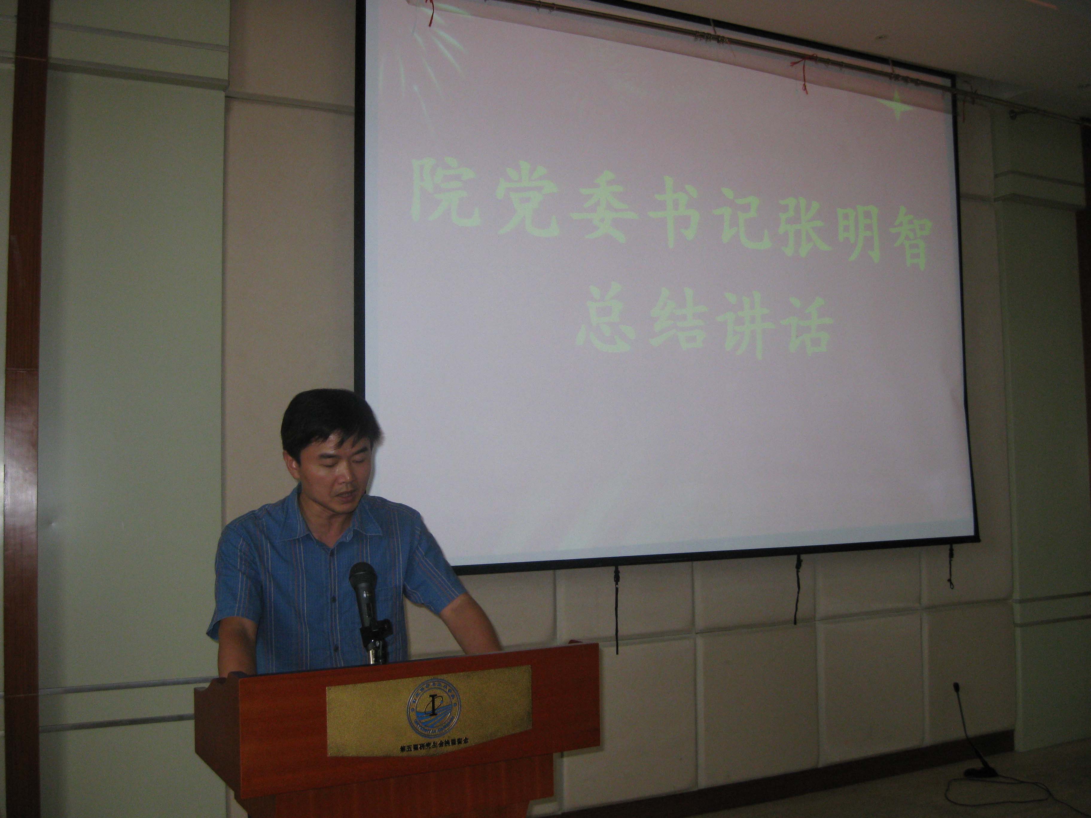 张明智作总结讲话。他首先代表学院向光荣加入党组织的新同志表示热烈的欢迎,向受到表彰的同志表示衷心祝贺!他指出,本次大会既是学院贯彻落实学校党委要求,扎实开展创先争优活动的一次再动员,也是一次迎接新同志的欢迎会及弘扬先进的表彰大会,更是一次迎接党的生日纪念大会。他希望,全院各基层党支部和全体党员要统一思想、提高认识,自觉投入到创先争优活动中来,为学院实施人才培养质量工程,推进数学一级国家重点学科建设等目标早日实现,重现厦大数学的新辉煌,贡献自己的青春和智慧。