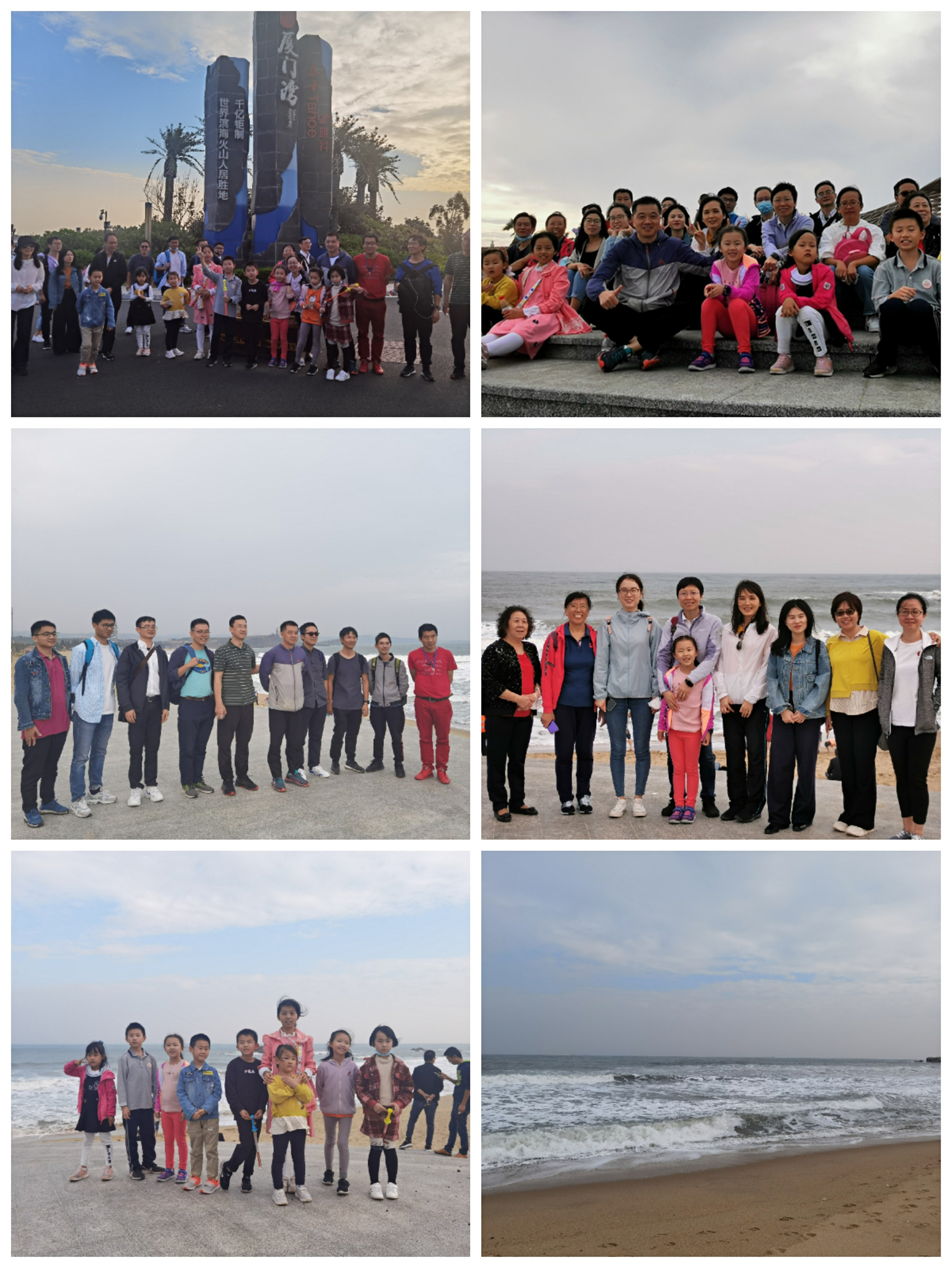 中午大家折返到海门岛品尝过地道的海鲜和地方美食后,兵分两路,玩累了或下午有事的老师直接乘车返回岛内,兴致不减的老师继续火山口游玩之旅。经过半小时的车程,大家来到了火山地质公园厦门湾海滩。金色海滩、汹涌澎湃的海浪让人倍感震撼;孩子们兴奋极了,在海滩上奔跑着、追逐着;女士们摆拍着各种姿势,留下美丽的倩影;男士们闲庭信步于海滩,海阔天空地畅聊,更有我们的轼波教授满身红在蓝天大海的映衬下成为最靓、最酷的一景!