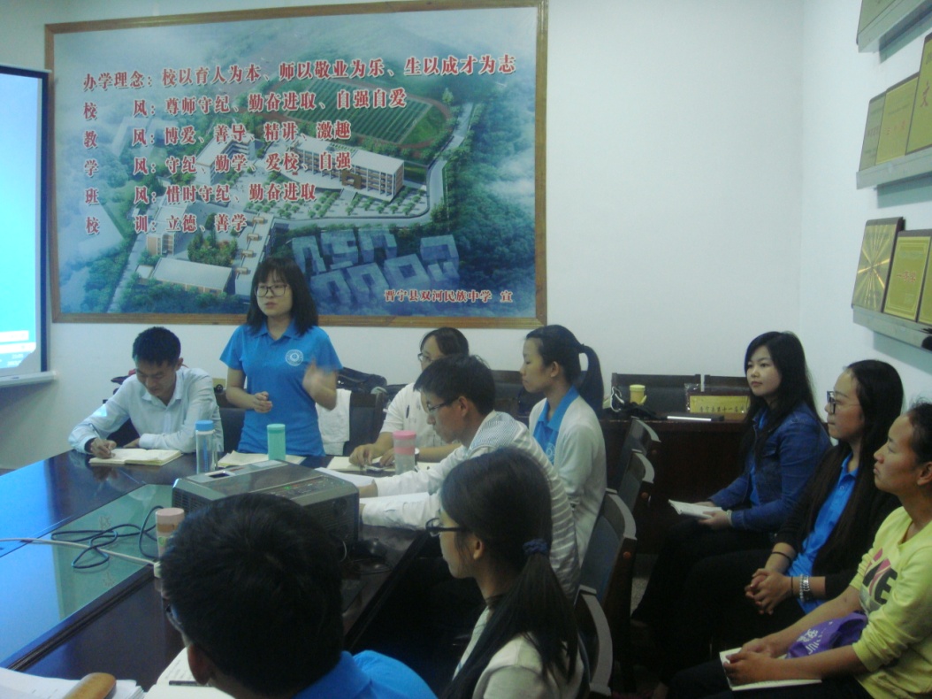 晚上7点30分,双河民族中学举行班主任会议,出席会议的有双河民族中学郭宁书记、张莉华校长和普亚佳副校长等校方领导,初一到初三共18位班主任以及实践队7名成员。会议上,双河民族中学85班班主任作主题发言,希望大家做一个快乐的老师。她组织实践队成员与老师们进行了接歌比赛,气氛热烈非凡。接着,实践队成员们以临时班主任的身份与老师们交流了这几周以来的工作感悟,张校长在会议的最后为成员们答疑解惑,希望在校期间双方能多多交流。