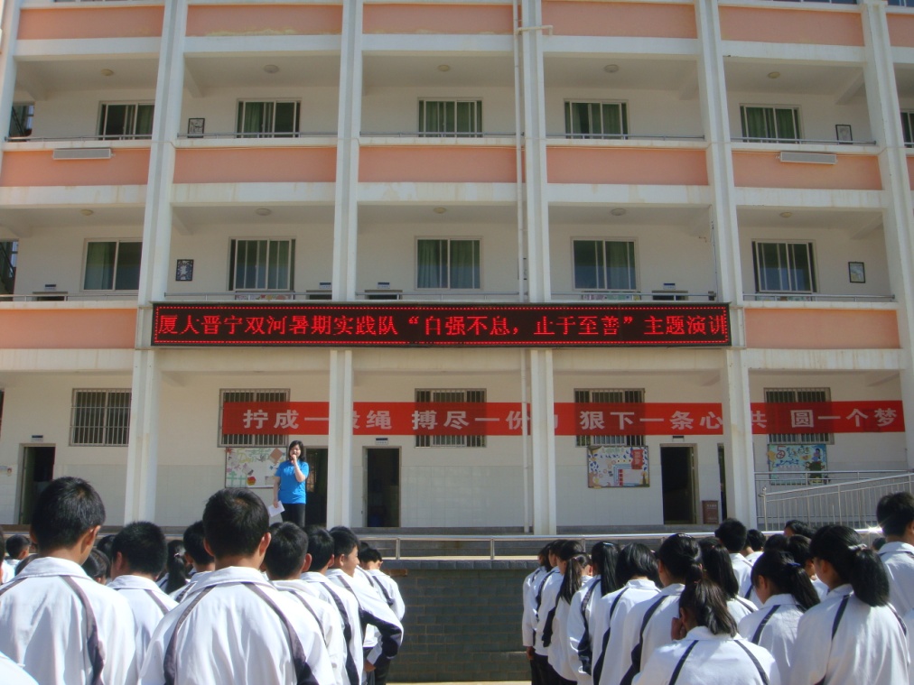 早上9点50分,在每周一次的升旗仪式上,队长朱怡欣作为实践队的代表上台发言。她首先感谢双河民族中学对实践活动的大力支持,接着以厦门大学的校训“自强不息,止于至善”作为主题,鼓励同学们努力学习,为自己的梦想拼搏。