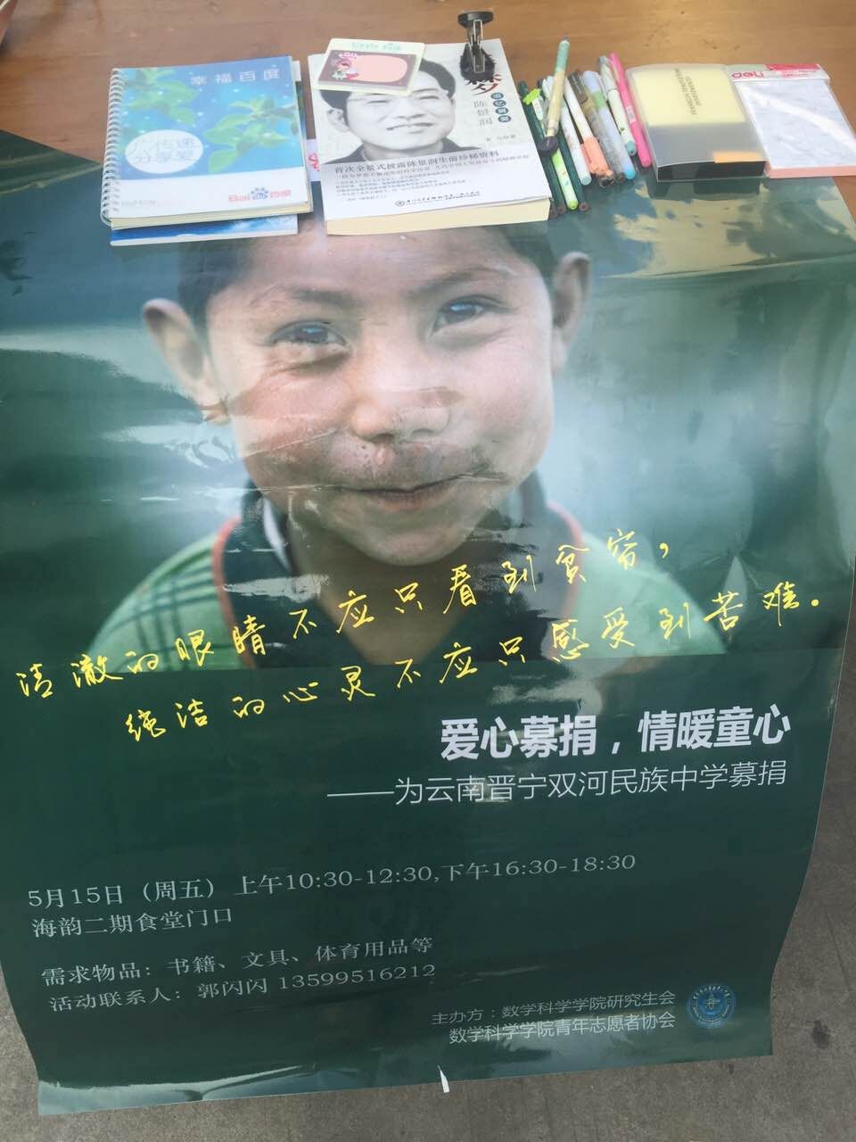 5月15日,我院研究生青年志愿者协会在海韵二期食堂门口举行了为云南晋宁双河民族中学的捐赠活动。