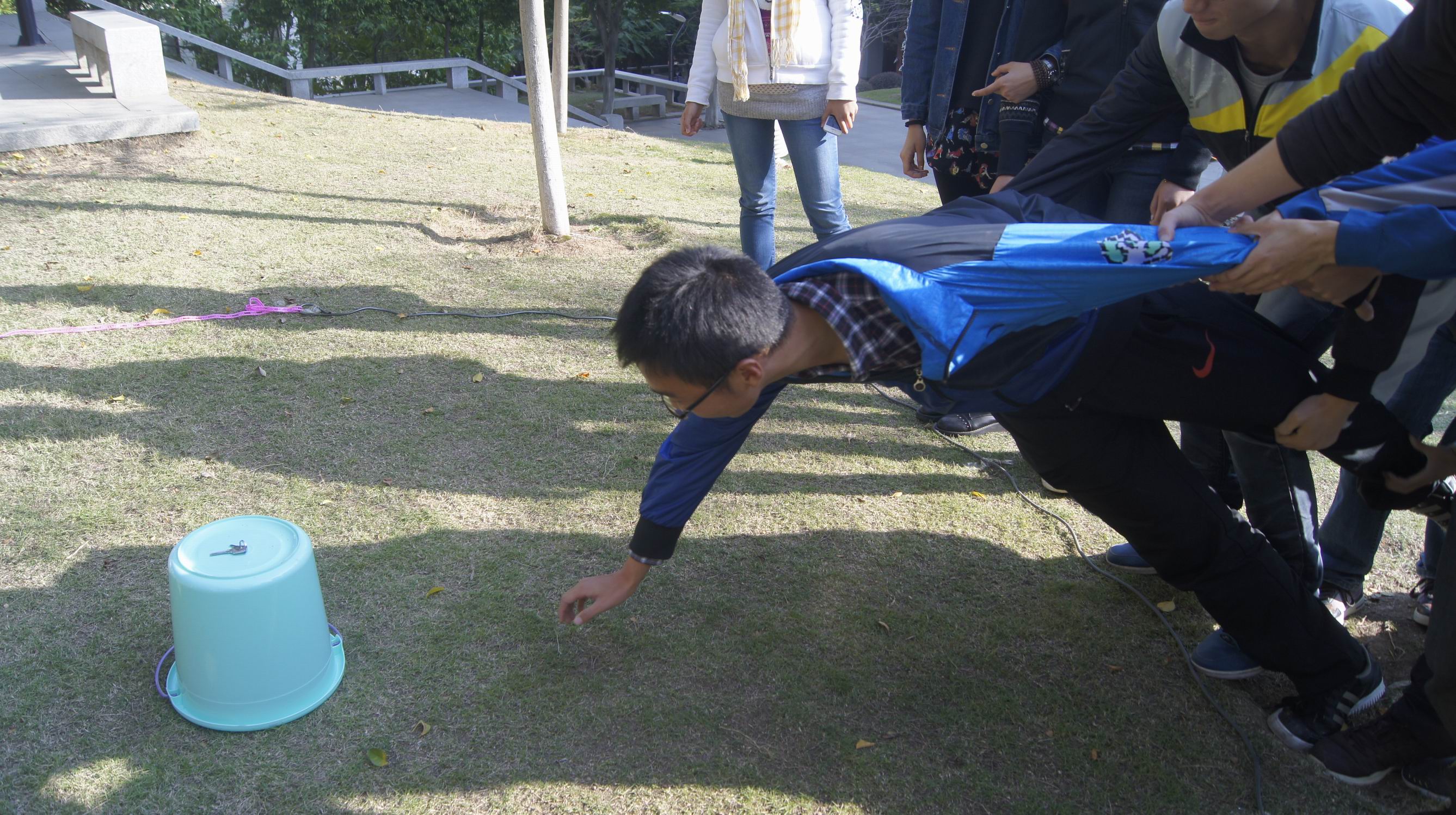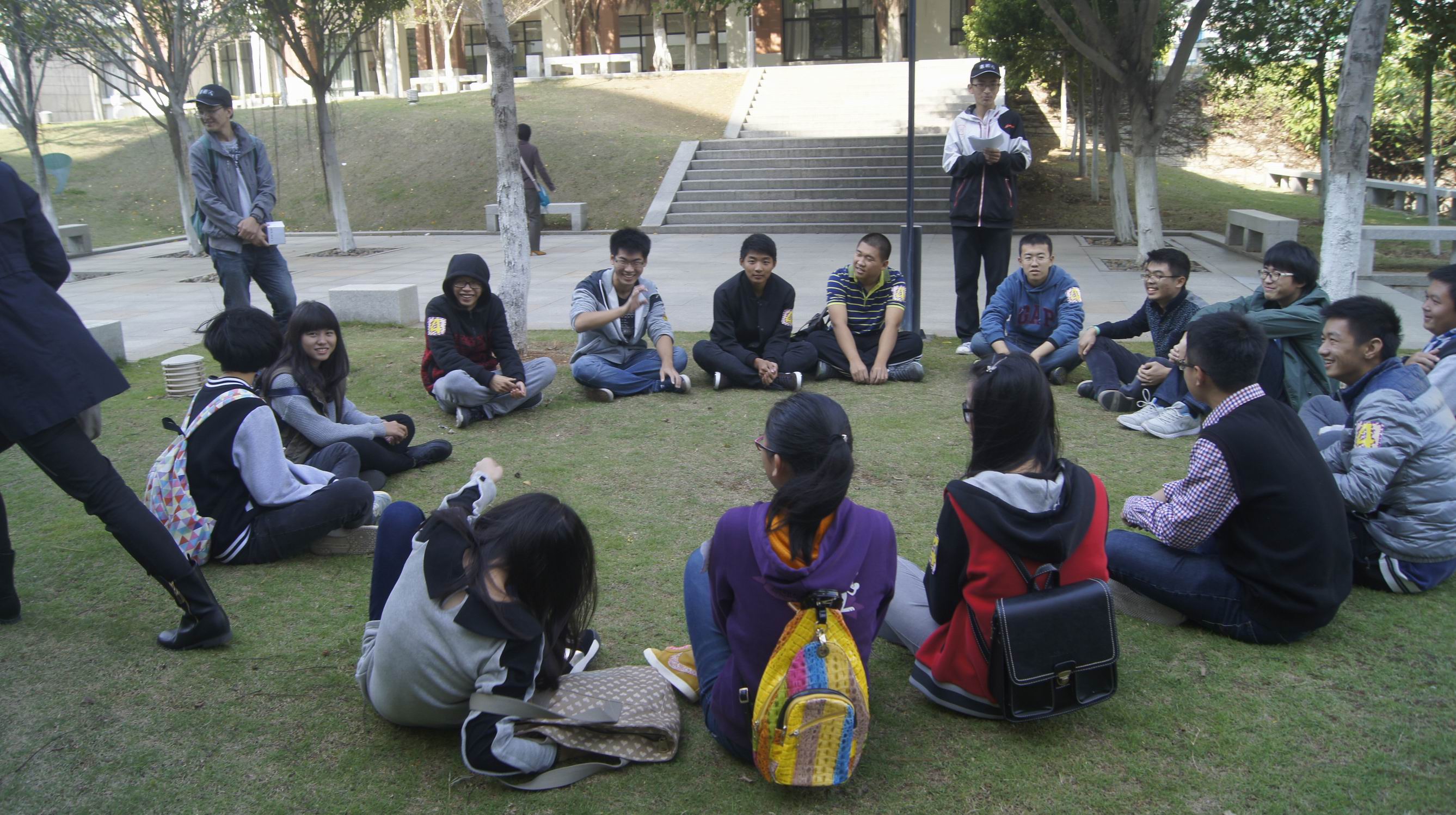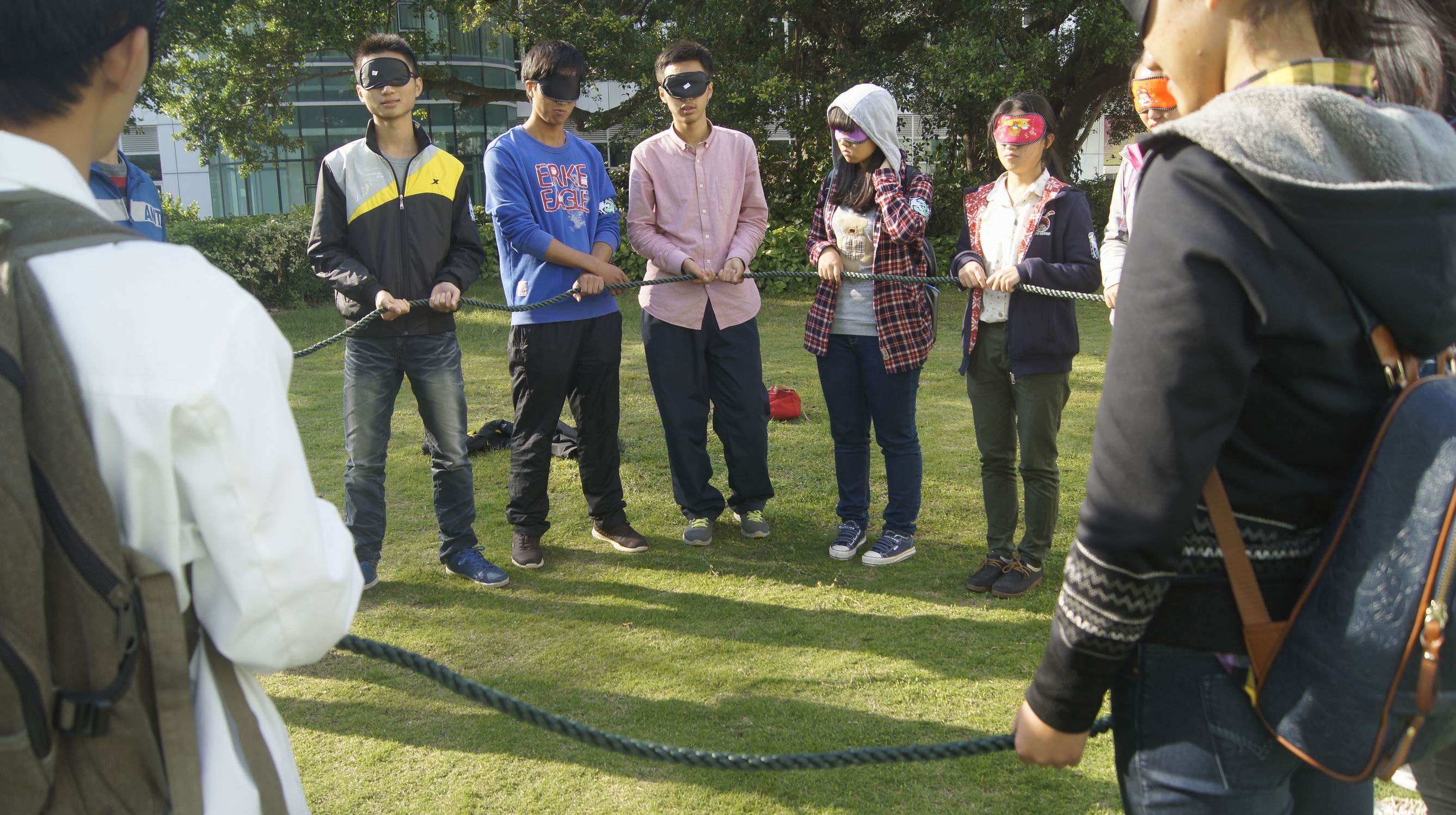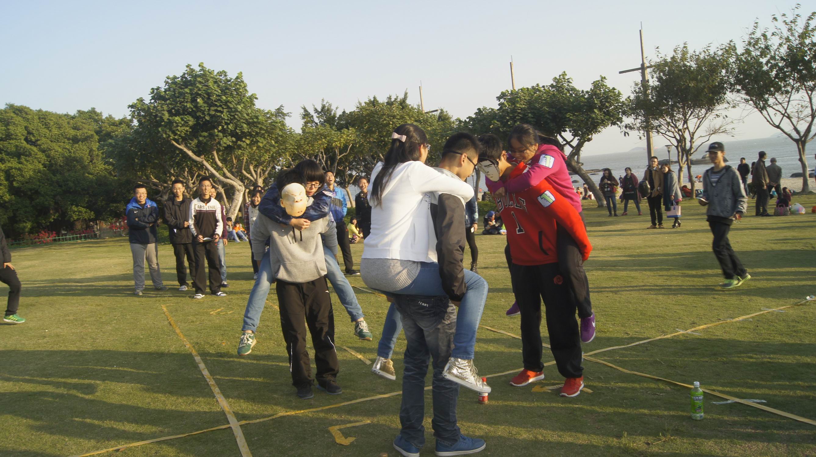 教官说明规则后,带领四组同学分别前往不同的地点进行活动。“记名字”、“盲人方针”、“智取钥匙”、“找信封”,这些趣味性与挑战性并存的团体游戏项目让大家开动脑筋,并且迅速让他们熟悉起来,打成一片。在海韵园、软件园、艺术学院完成相应任务后,所有小组齐聚珍珠湾,进行组间对决——“男生女生向前冲”。在亮色胶带画出的十字跑道上,男生蒙眼背负着女生进行了一次趣味赛跑。最后,由每组推选一位代表,根据完成任务获得的线索推理,投票选“卧底”。
