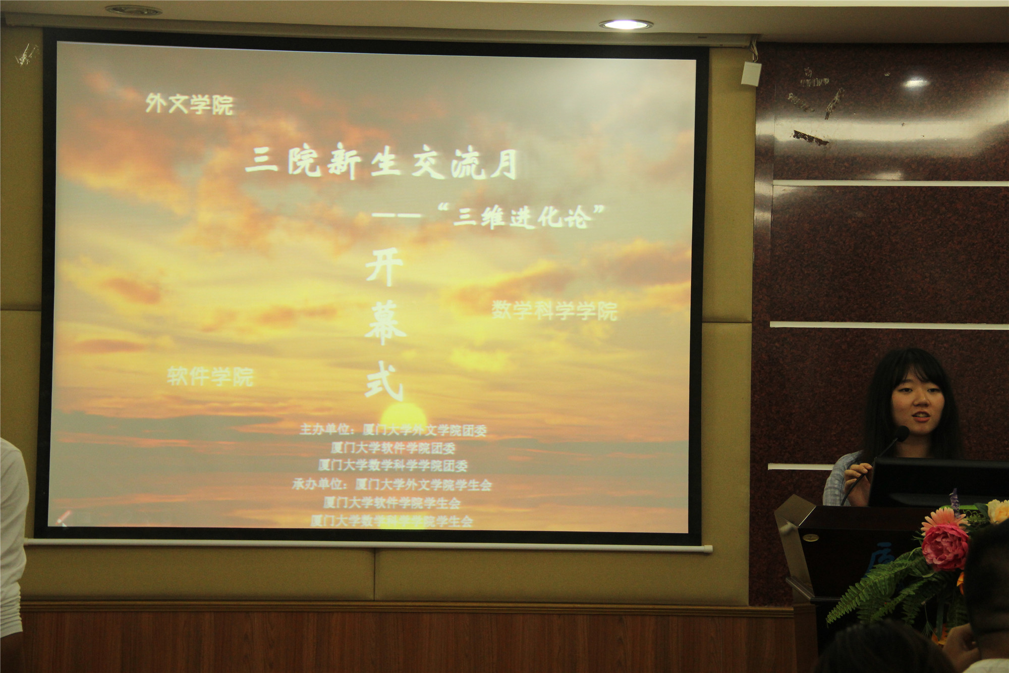 随后,来自三院的代表分别上台介绍了本院的品牌活动或优势项目。外文学院的胡凡同学首先对外文卡拉OK大赛进行了展示。高举“中国人唱外国歌,外国人唱中国歌”的主题旗帜,外文卡拉OK即将于今年迈入第十一个年头。光影陆离的舞美、响遏行云的歌声、惊喜连连的表演形式……外文卡拉OK的每年举办都反响热烈,为同学们津津乐道数日。俗话说过,一个成功男人的背后必定有一个成功的女人。能举办出如此声势浩大的活动,其身后必定有一个出彩的团队。胡凡同学的一番发言将这个团队的风采展示得淋漓尽致,外文学生干部的工作能力可见一斑。
