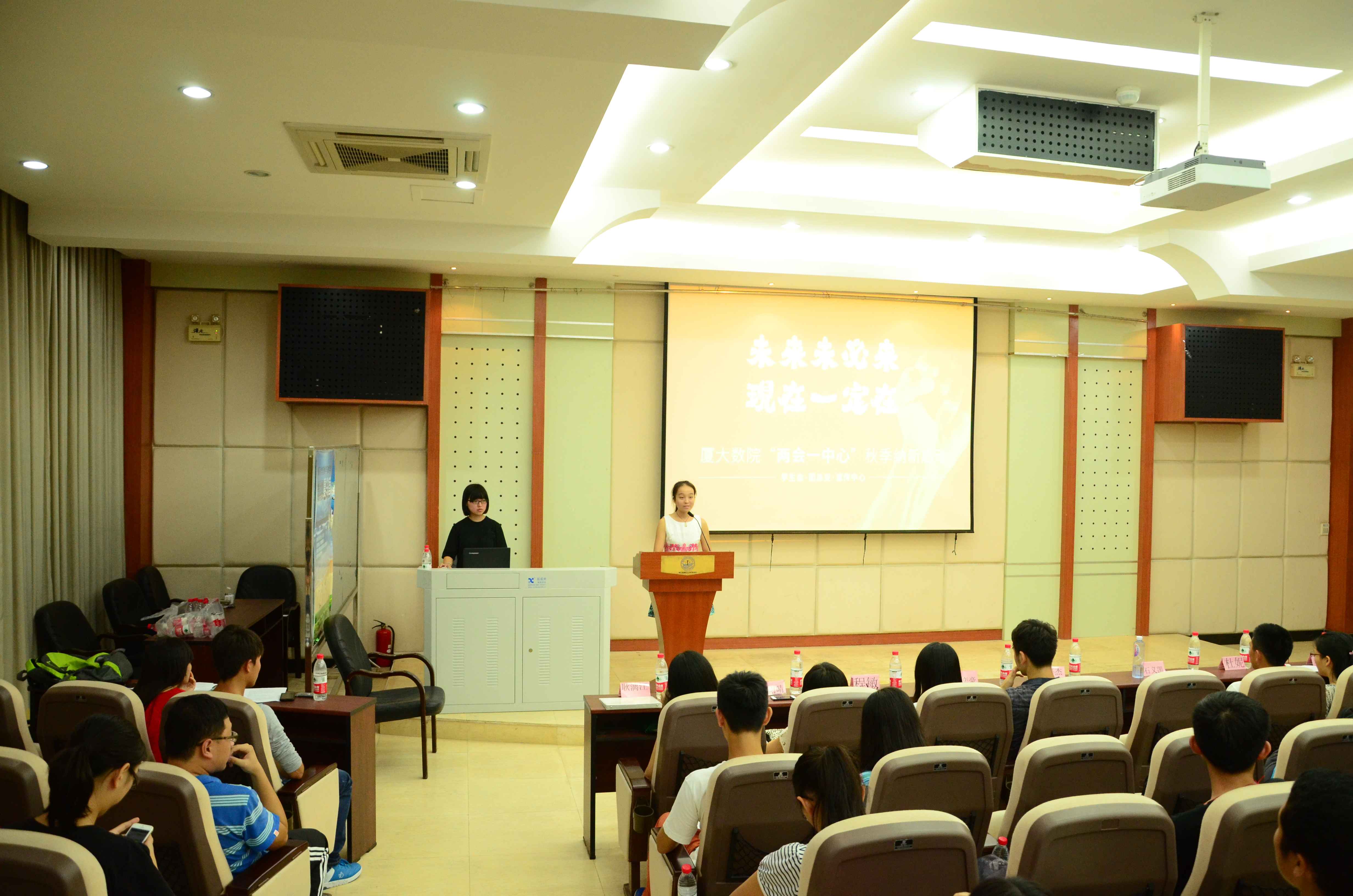 2014年9月19日晚七点,为促进2014级新生对学生会各部门工作的了解,我院在海韵教学楼504召开“两会一中心”纳新宣讲会。参加此次纳新宣传会的有辅导员石义凯老师,2014级班主任杜妮、周达老师,兼职辅导员蔡庆淞,“两会一中心”主要学生干部以及2014级全体新生。本次大会由学生会主席魏向主持。