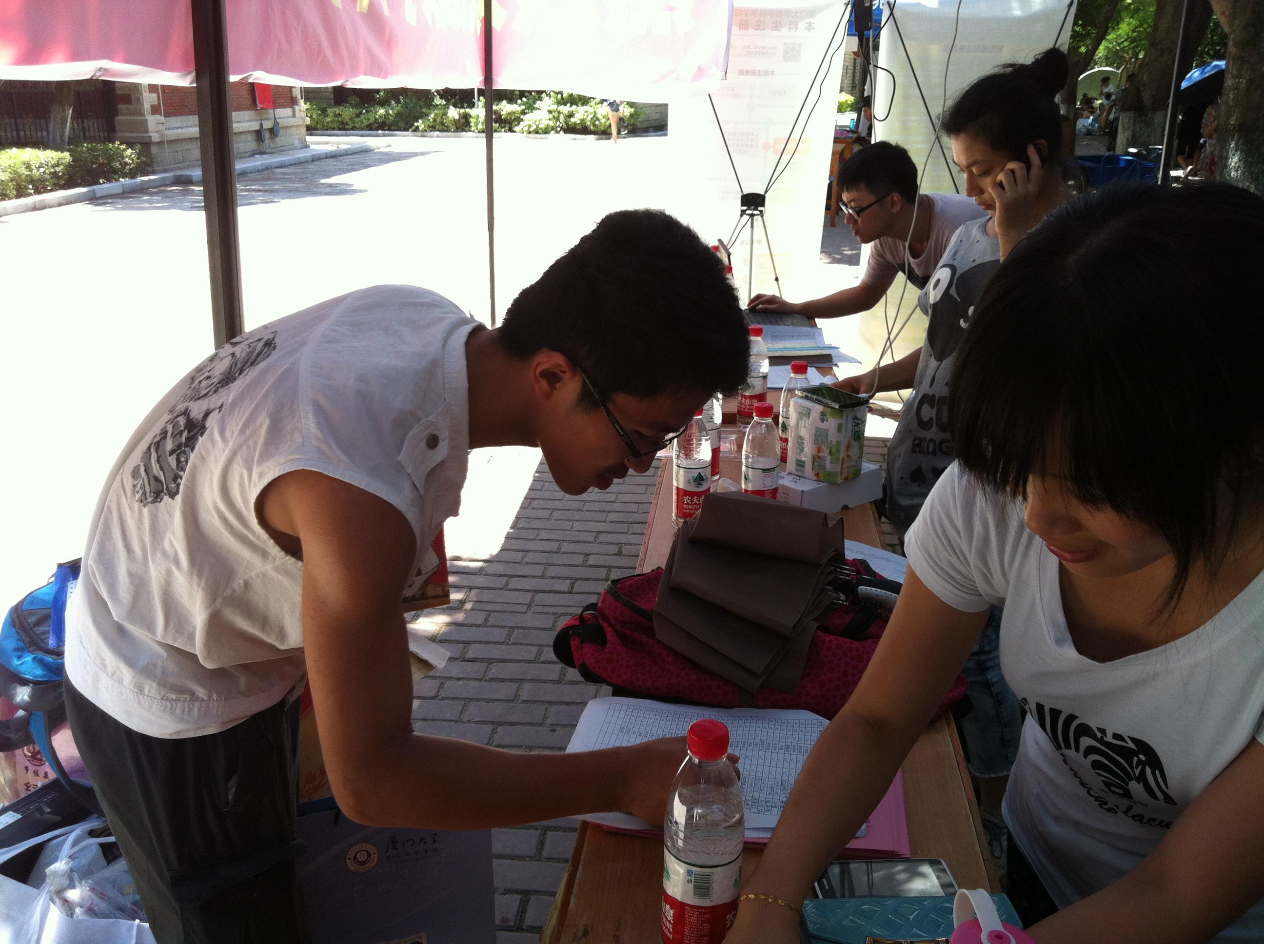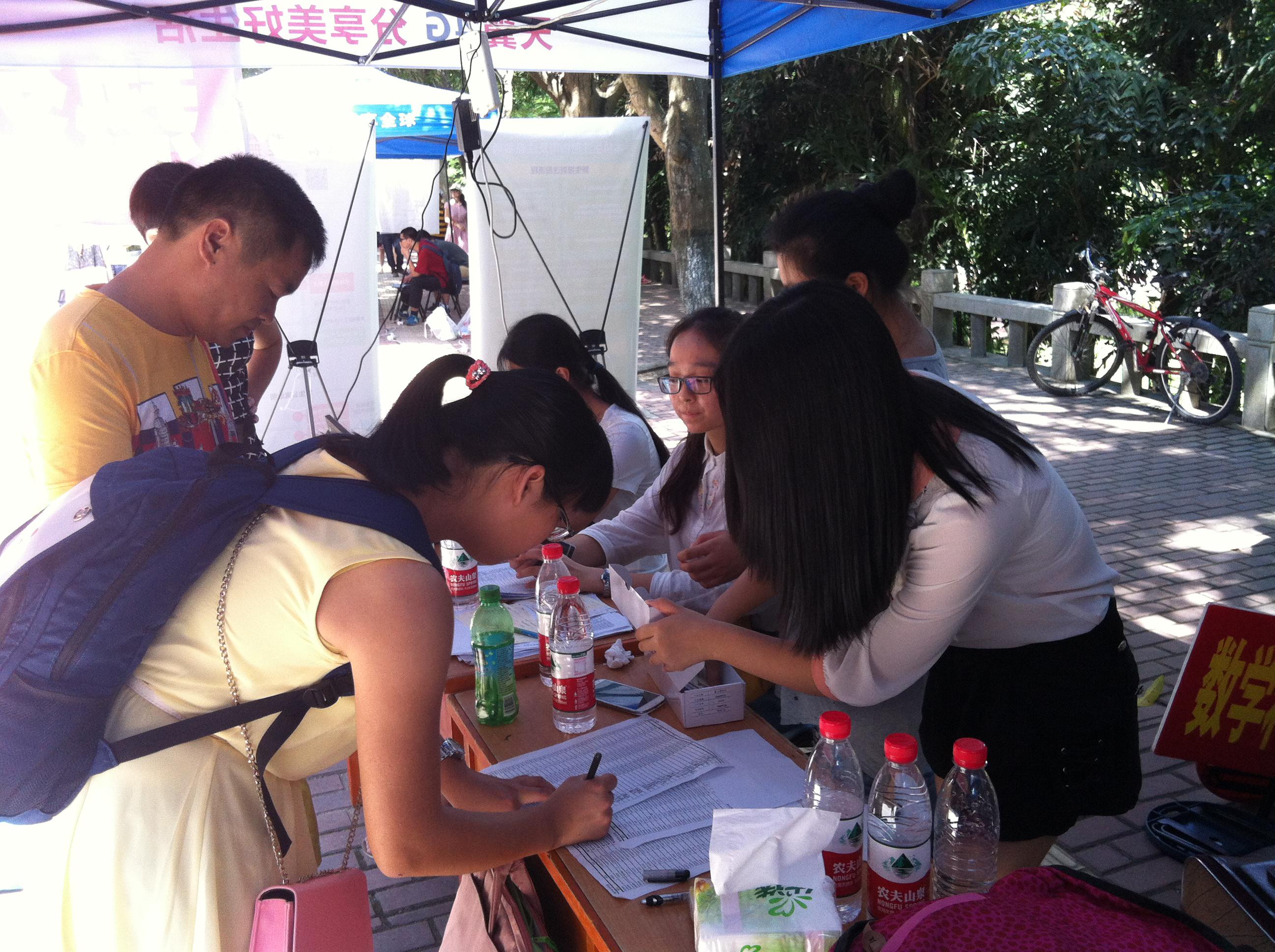 临近中午,烈日当空,骄阳似火。众多学长学姐们如坐针毡,焦急地等待这一位“马上就到校门”却迟迟难以抵达目的地的压轴小学弟。学长学姐对吴忠二小学弟真是望眼欲穿呐。不过,在倒数第二个报到的郑南艺同学的帮助下,相关的志愿者们顺利联系上了吴忠二同学。12点20分,在学长学姐们的掌声和欢呼声中,吴忠二同学风尘仆仆到达数院迎新点。