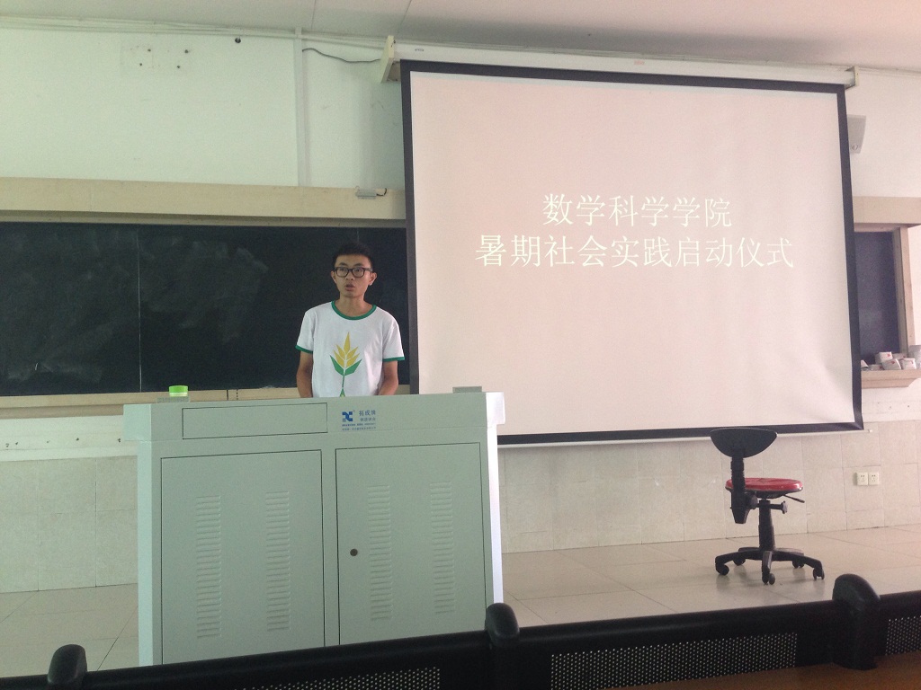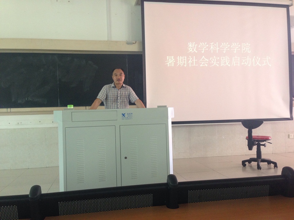 随着本学年的学业课程接近尾声,我们又迎来了另一个提升自我、增长见识的课堂——暑期社会实践。为确保暑期社会实践活动的顺利进行,7月18日上午,我院在公寓教学楼301召开2014年暑期社会实践启动仪式。院党委副书记郑诚明老师,院团委副书记陈向柳老师,概率统计班主任王文元老师,兼职辅导员张昆卿、陈淑铌老师出席此次大会。
