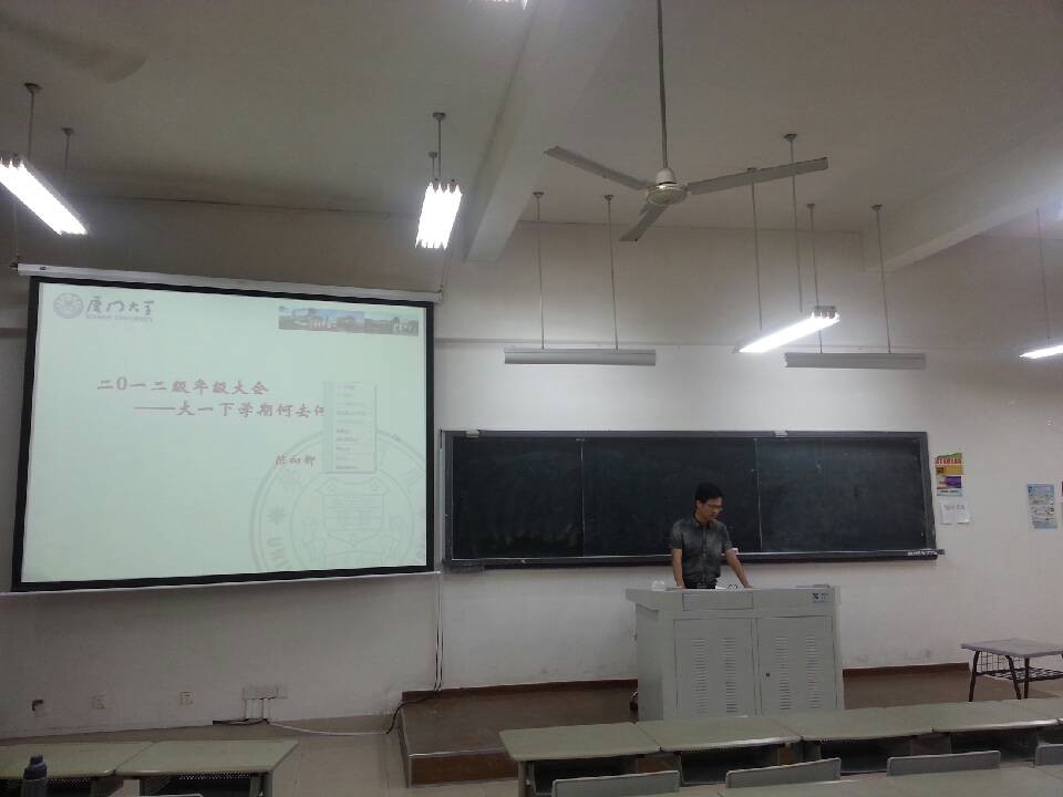 本次大会以“大一下学期何去何从”为主题。首先,他就2012级同学下半学期的种种表现作了总结,一方面告诫同学们要少接触网络游戏、网络小说,谨防上瘾;另一方面,他对同学们提出更高要求,鼓励同学们多多参加有利于自身发展的社会实践活动、竞赛,为自己的未来做好规划,并大力赞扬了“帮扶计划”这种有爱的学习模式。