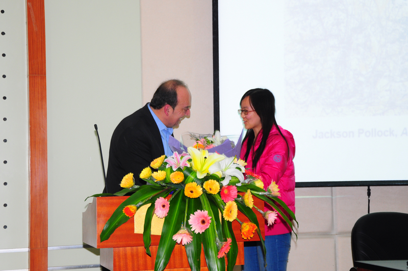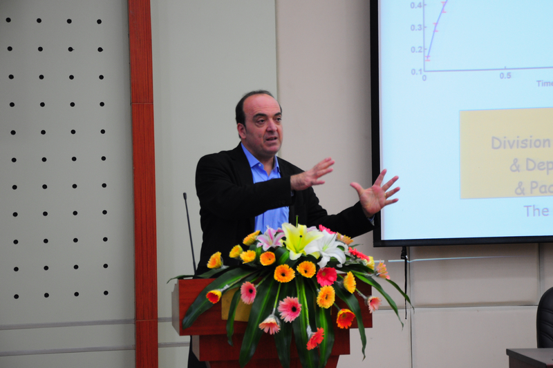 报告厅内座无虚席,后排站满了前来听讲座的同学。首先,George教授由不确定性引入主题。数值模拟也叫计算机模拟。它以电子计算机为手段,通过数值计算和图像显示的方法,达到对工程问题和物理问题乃至自然界各类问题研究的目的。George教授举出了他们在实验室中模拟的脑损伤以及蝙蝠飞行过程的动力这两个例子,来说明如何进行数值模拟。接着,教授通过随机动力系统的两个例子(非线性单摆运动的随机动态和肿瘤细胞的生长系统)讲解了低维的情况下如何求解,此时的数学模型与实验结果吻合得很好。进一步又讲解了在高维情况下的求解方法,并以水沸腾时的热量扩散为例。在讲座第二部分,George教授为我们介绍了一些当今最前沿的科研成果。讲座结束后学生代表为教授献上鲜花。