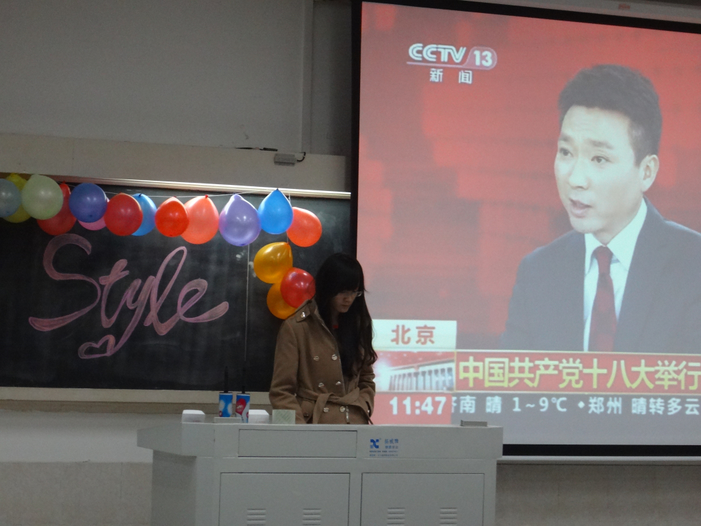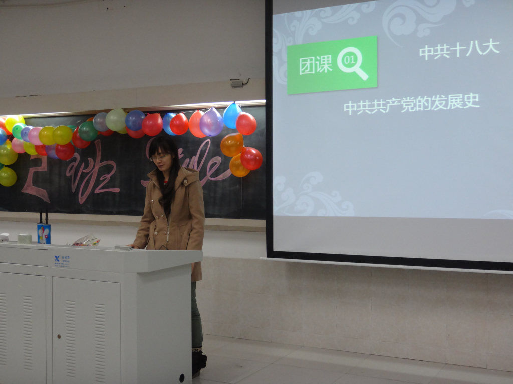 班会的第一项,通过珍贵的历史视频材料,团支书林琴带领大家回顾了中国共产党成立的过程,随后又对于刚刚结束的党的十八大精神进行了全面而深入的介绍。通过过这一学习活动,同学们对于十八大有了清晰明了的认识,在更好领会十八大精神的同时,更加深了对于党的感情,坚定了跟党走的决心。
