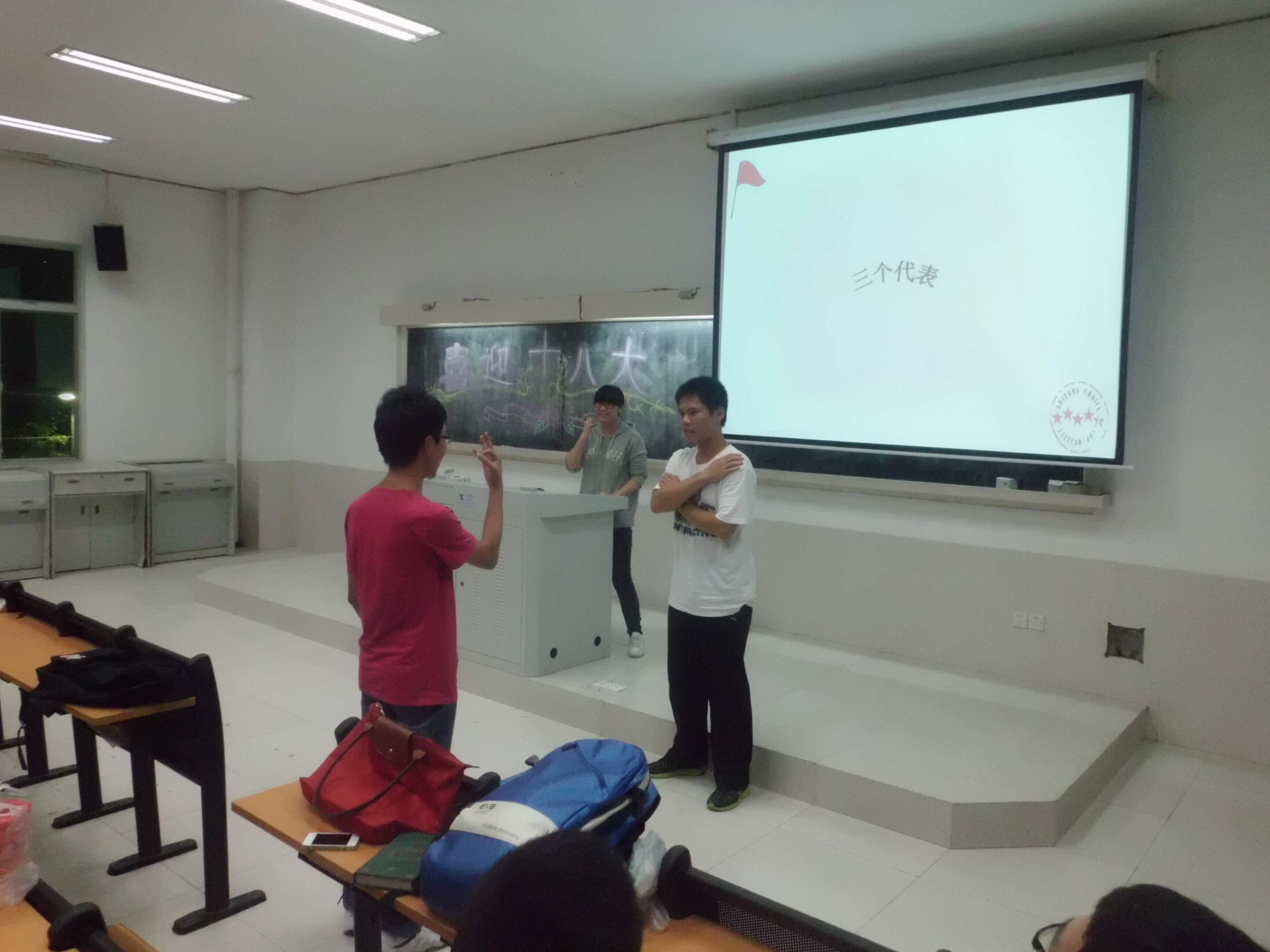 11月12日晚七时,为响应十八大号召,提升支部凝聚力,进一步增强大学生对党、对祖国的深厚感情,9001cc金沙11级2班团课在海韵公寓教学楼204火热展开。