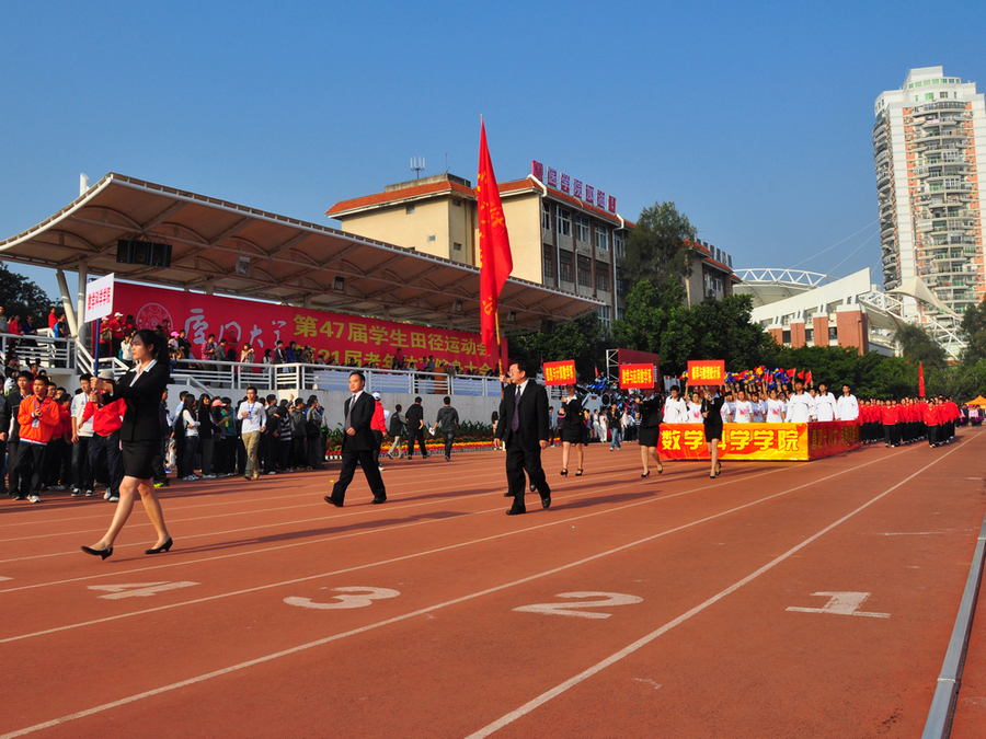 2012年11月2日星期五上午八点,厦门大学第四十七届运动会暨第二十一届老年体育健身大会在本部演武场隆重开幕。我院党委书记张明智,党委副书记郑诚明、谭忠教授,团委副书记陈向柳,辅导员石义凯老师带领了由我院各年级本科生组成的表演方阵出席开幕式。