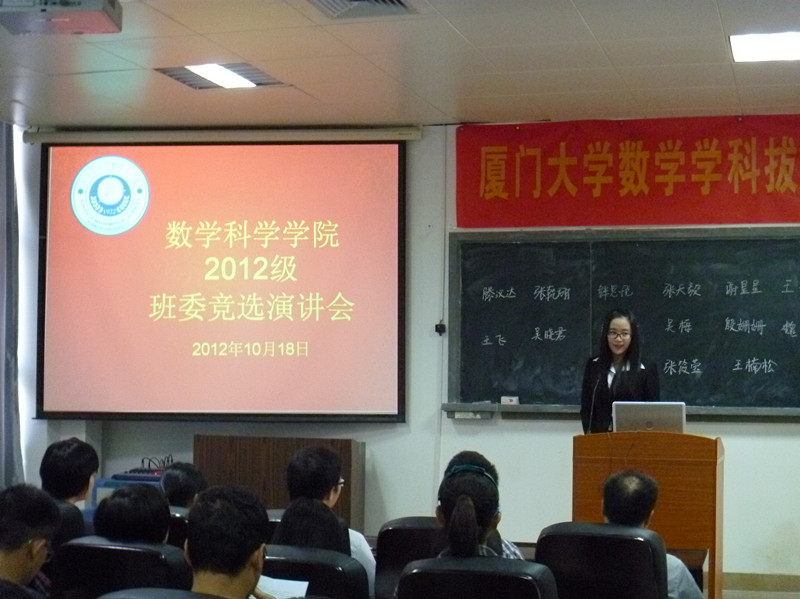2012年10月18日上午,9001cc金沙新生班委竞选演讲会在海韵园实验楼105顺利举行。学院党委副书记郑诚明老师,团委副书记、09、12级辅导员陈向柳老师,10、11级辅导员石义凯老师,12级1班班主任陈竤焘老师,12级2班班主任陈黄鑫老师,兼职辅导员陈淑铌、张昆卿老师, 12级两个班全体同学参加了此次演讲会。