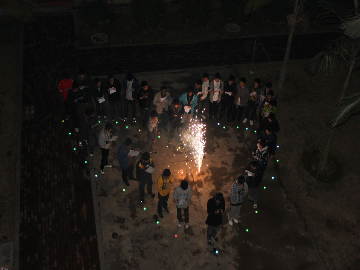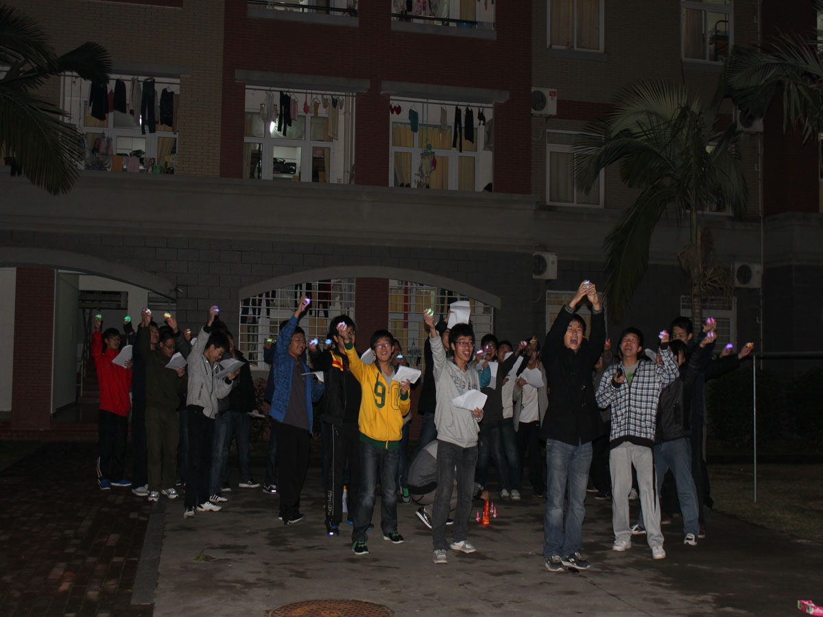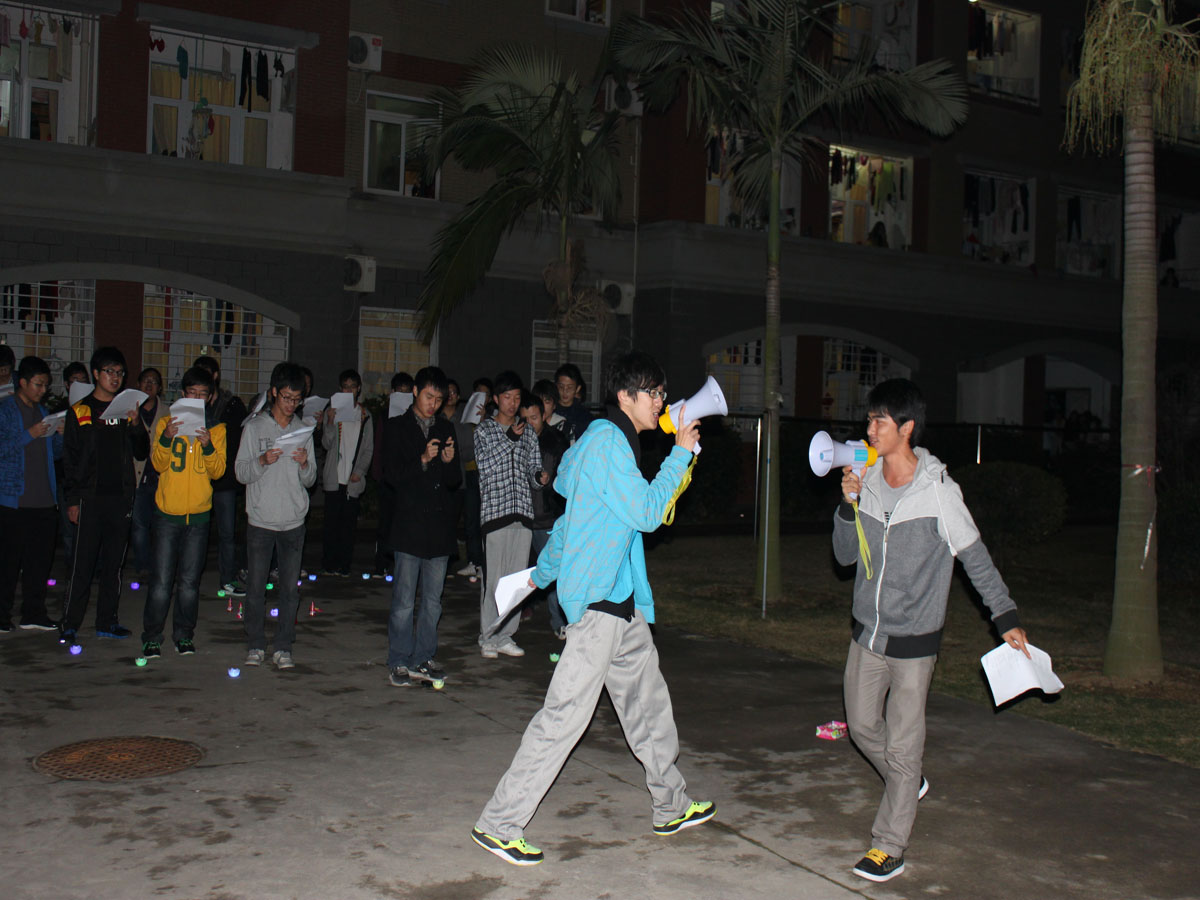 晚上11点左右,我院三十名男生在女生楼下按“心”型排开,为女生们献上了精心编排的《数院男生女生节串烧歌曲》,晶莹的彩灯在夜幕下顽皮的变换着色彩,就像同学们激动的心情,一曲接一曲的祝福歌曲,让我们感受到青春的活力与精彩。