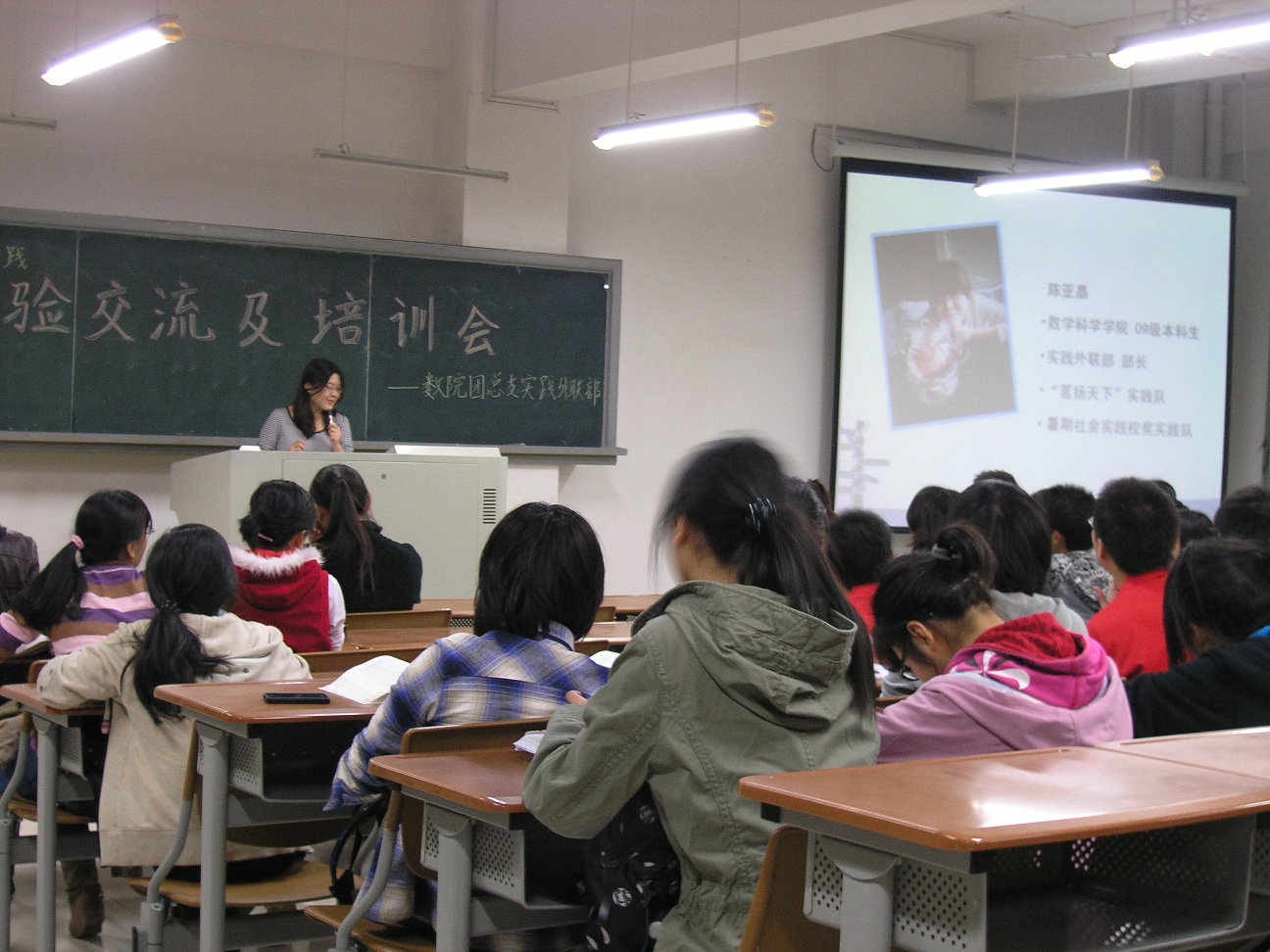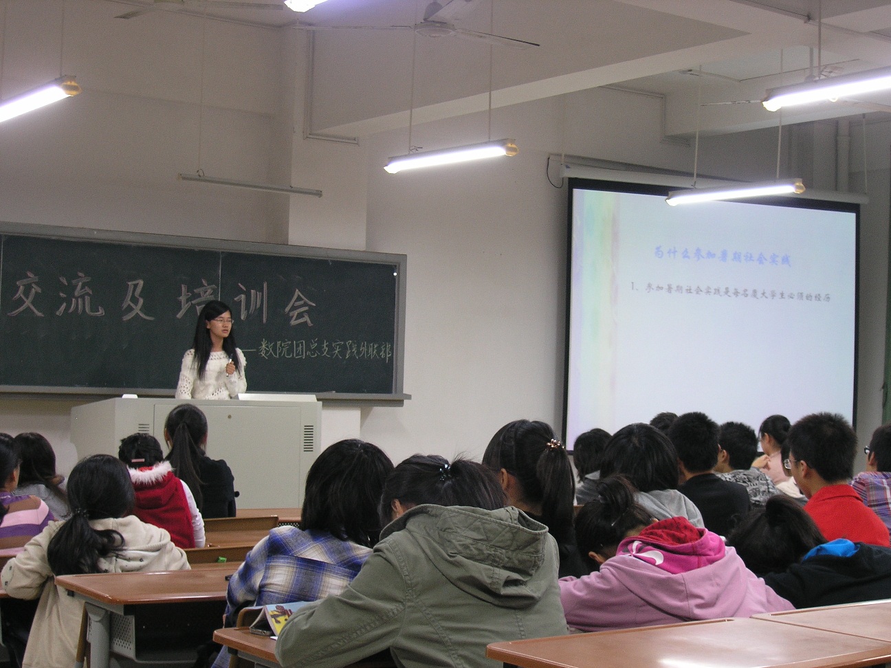 交流会上,09级陈亚晶、08级张哲睿、10级郑鹊、10级吴璇以PPT、电子杂志的形式依次向11级的同学们介绍了什么是社会实践,社会实践形式的种类、形式、流程和社会实践的意义与带来的收获,并向学弟学妹们简要展示了她们去年的社会实践成果和她们从实践中得到的宝贵经验。