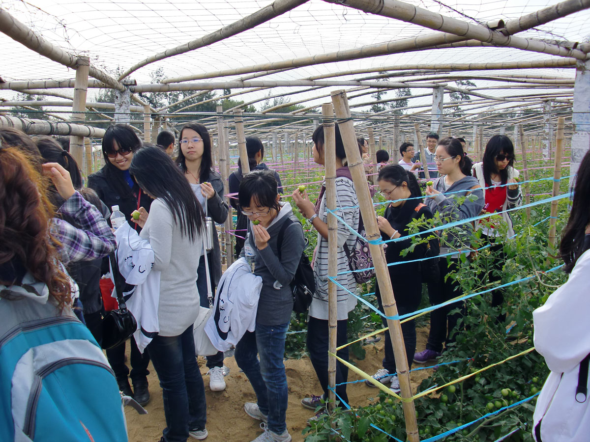 同学们参观黑妃番茄种植区