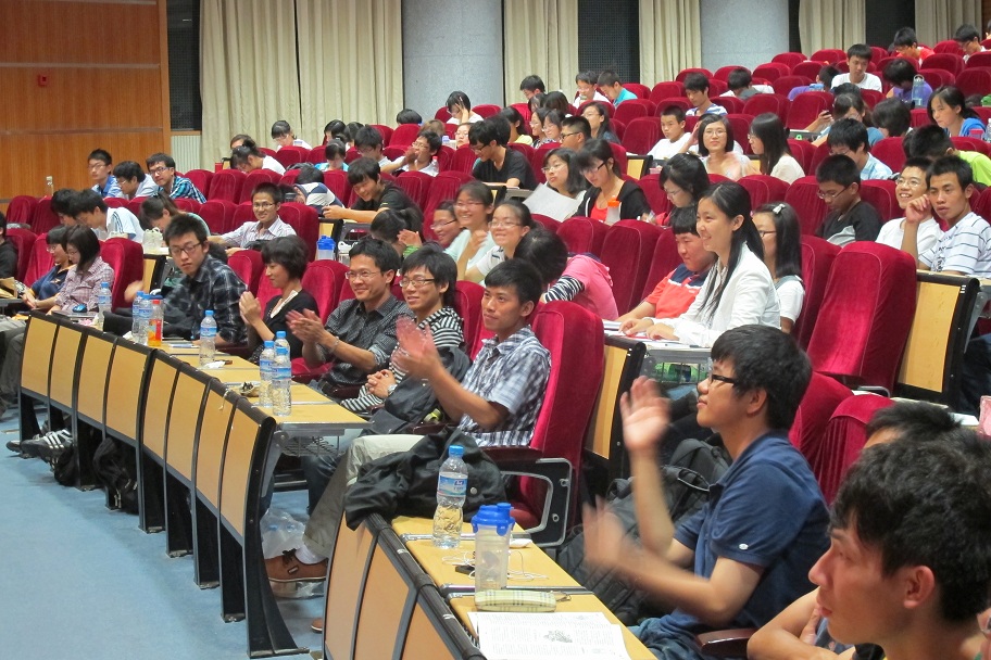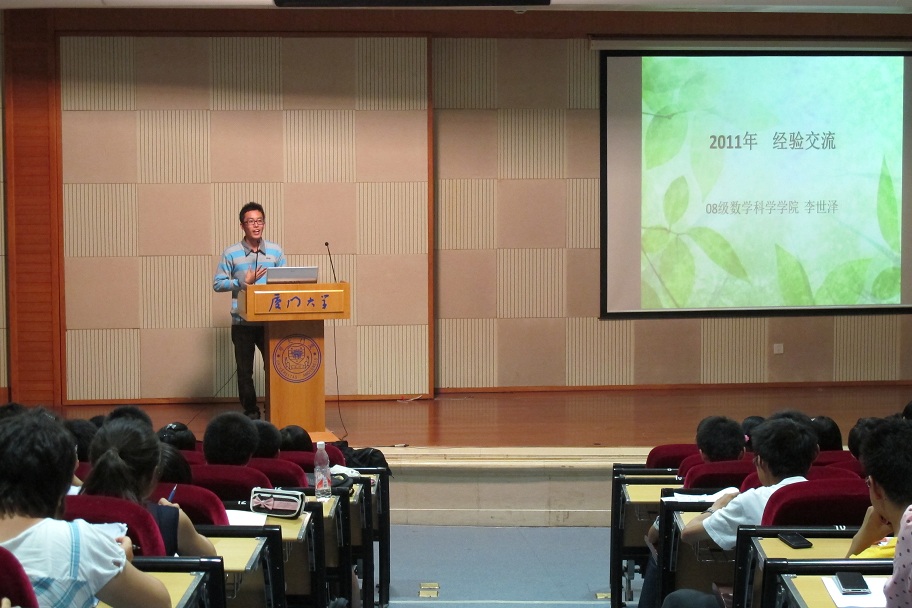 首先发言的08级国奖获得者李世泽学长一周前便广泛询问学弟学妹们有什么问题,做了精心准备。学长介绍的出国准备经验、国外交流体会和英语考试准备方法,让大家获益匪浅。08级方宇翔学长则是在保研条件、夏令营选拔、08级保送情况、保研申请技巧等方面对保研进行了详细介绍。随后,保送至中国科学院应用数学所的08级何盼学姐讲述了自己大一大二酸甜苦辣的亲身体验和保送经历,诙谐幽默的语言引起大家的阵阵笑声与掌声。