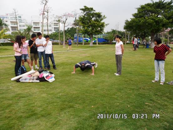 2011年10月15日,秋高气爽,丹桂飘香,在珍珠湾草坪上有一群从书堆中爬出来的嫩头青——厦大数学院11级研究生新生,来到一片青葱的草地,面朝大海,心神怡然。学院领导秉持着一切为了学生的原则一手策划了此次活动,在教育学院的学姐们的指导带领下,活动便井然有序地进行起来了:
