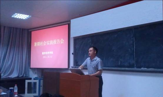 2011年学院 “暑期社会实践报告会”于10月12日下午6点在海韵园实验楼105召开。学院党委郑诚明副书记、团委书记黄兆君、辅导员陈向柳,以及兼职辅导员周薇、蔡晓倩、陈国渊出席了此次会议,与会的还有参加2011年暑期社会实践的实践队负责人及部分队员。