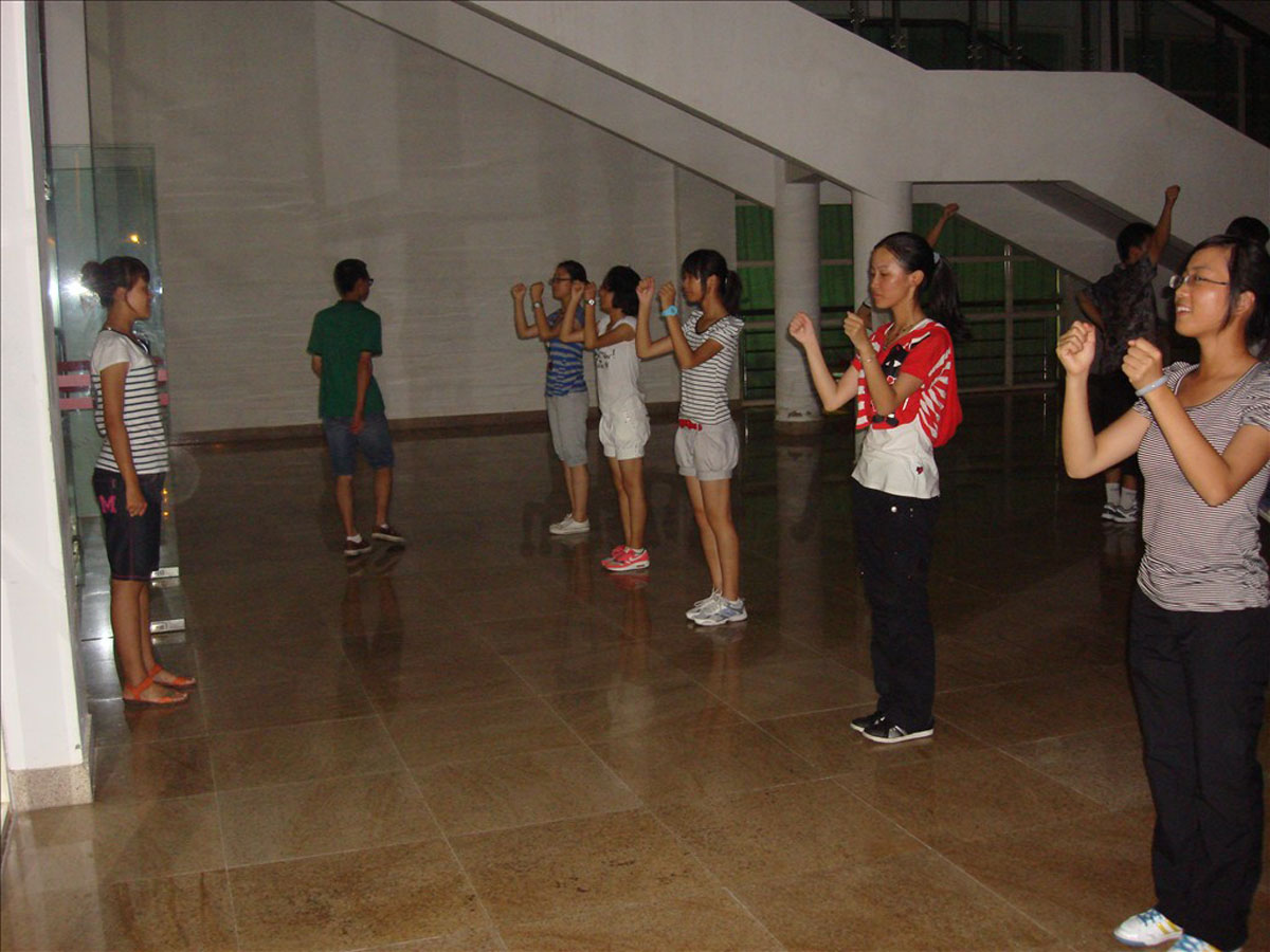 而在风雨球馆的另一侧,参加广播操比赛的同学们也在认真的训练着,虽然时间已经很晚了,但是丝毫没有减弱同学们的热情。天气炎热,很多孩子练了没多久就已经汗如雨下,但为了学院的荣誉,没有人选择退缩。在10级与11级领队同学的指导下,他们一个动作一个动作的学习,通过定型与不断地修改让每一个动作都臻于完美,队形也越来越整齐划一。