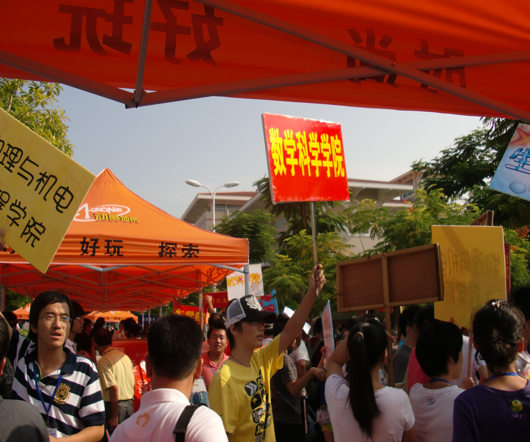 10级志愿者的迎新热情随气温不断高涨,引导组的志愿者们翘首以盼,其先锋部队在迎新专车下车点高举”9001cc金沙”的牌子,让数院的学弟学妹能够第一眼找到归属感。