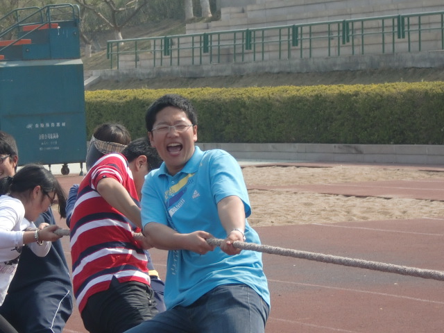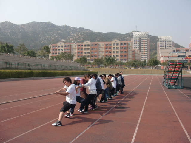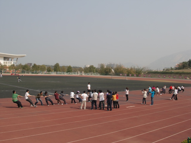 下午2:10,基地班所有同学在北区田径场集合,开始了一场久违的游戏----拔河比赛。比赛以车轮战的形式展开。由于实力差距,第一组的同学不费吹灰之力赢得了比赛。比赛结束后,各位同学依然兴致勃勃,进行了各种形式的比拼,玩得不亦乐乎。