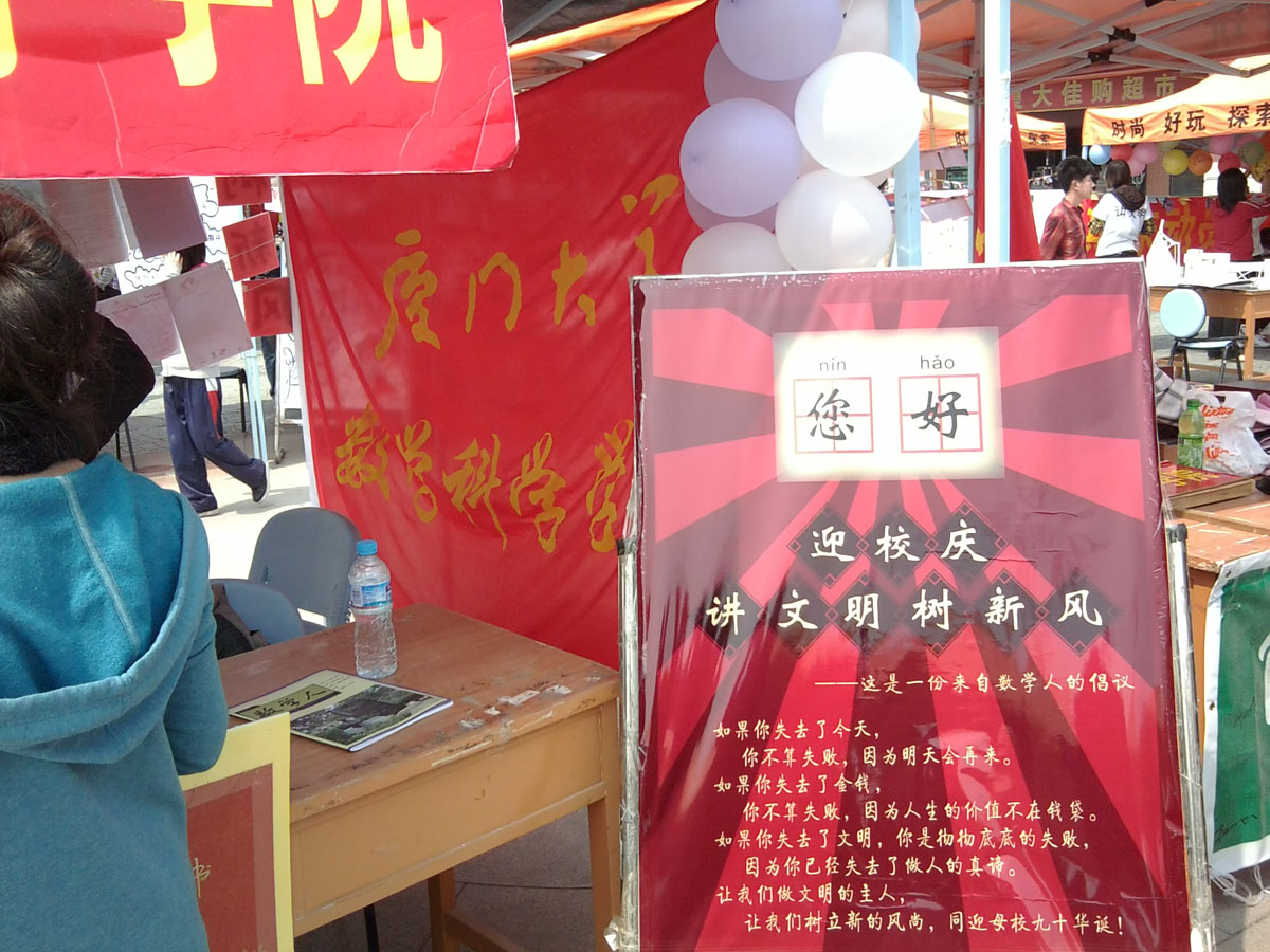 上午8:30,我院督导部就来到步行广场,开始了紧锣密鼓的现场布置。我院的活动展示分为五大部分:“宿舍美化大赛及宿舍文明公约”成果展示、知识问答之数学猜谜、“我们要对母校说”祝福征集、院刊展示和数学人文明公约。我院精彩的宿舍文化生活和有趣的数学猜谜游戏吸引众多同学驻足观看。