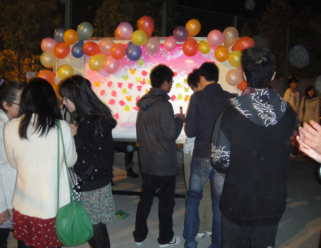 一进入舞会现场,首先引入眼帘的就是一块装饰温馨的许愿墙,同学们纷纷在这里写下自己的新年愿望。每位同学在进入舞会现场时都会拿到一个号码和一张写着分组的精美书签。相同的号码让原本互不相识的男生女生成为今晚默契的搭档,在舞池中浪漫共舞,在游戏中齐心协力。