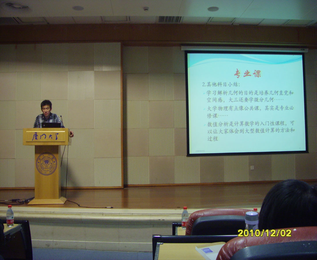 首先与大家分享经验的是08级本科生、“三百分”传奇学长沈忱。专业知识方面,学长对各科目作了简单介绍,着重强调了数学分析与高等代数课程的重要性,并与大家分享了其宝贵的学习经验。数学建模竞赛方面,学长介绍了比赛的重要性与意义,并告诉同学们如何尽早为其做准备。