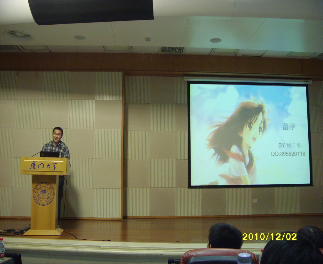 第四个发言的是07级本科生程千顺学长。他从出国目的、出国的利与弊、如何为出国做准备三方面让同学们对出国有了更加明确的认识。学长的幽默风趣不时赢得同学们的掌声。