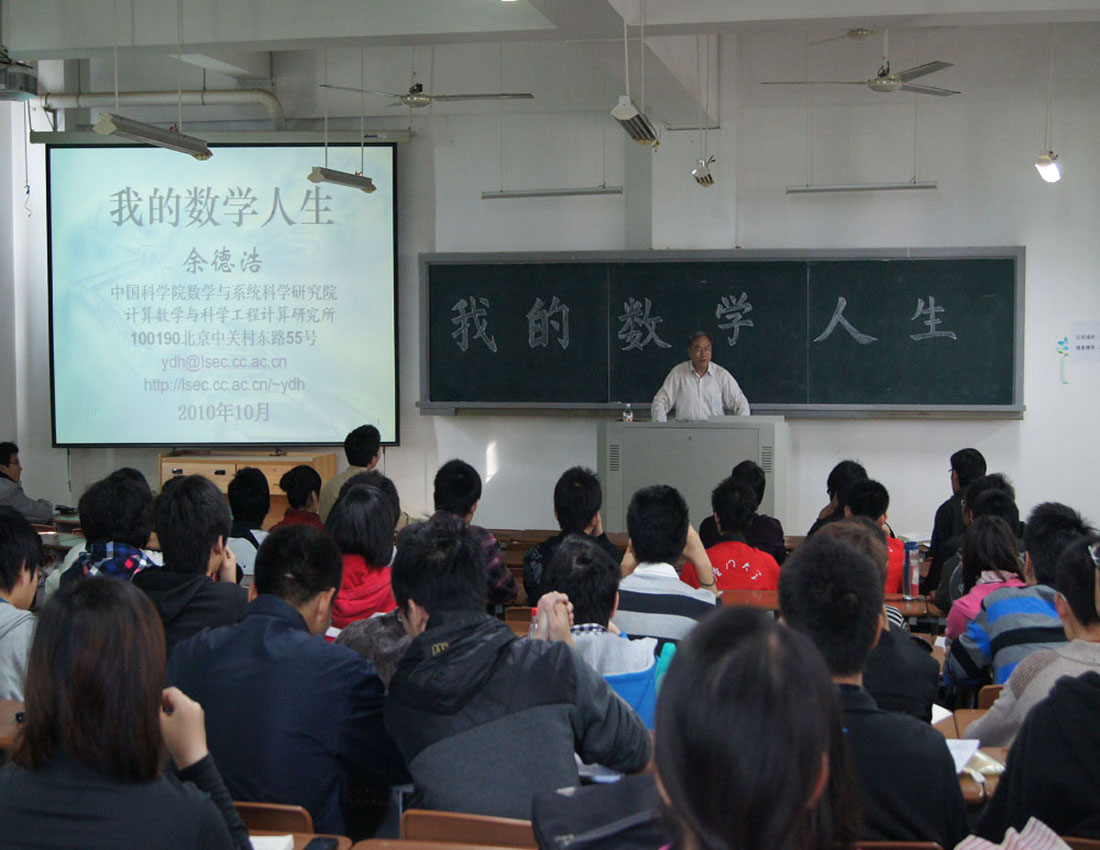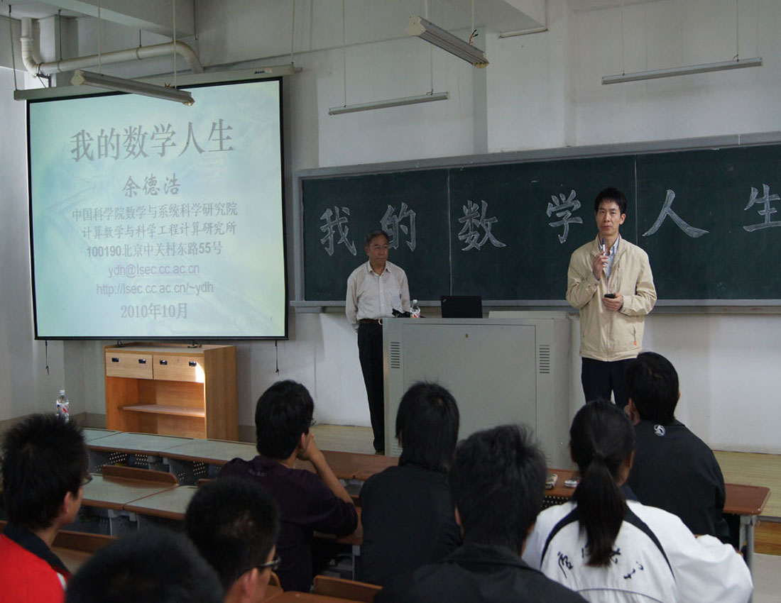 11月27日上午10:00,应学院邀请,中科院计算数学与科学工程计算研究所副所长余德浩研究员到漳州校区作题为“我的数学人生”的精彩讲座。我院副院长许传炬教授主持讲座,并与我院大一大二同学一起聆听了讲座。