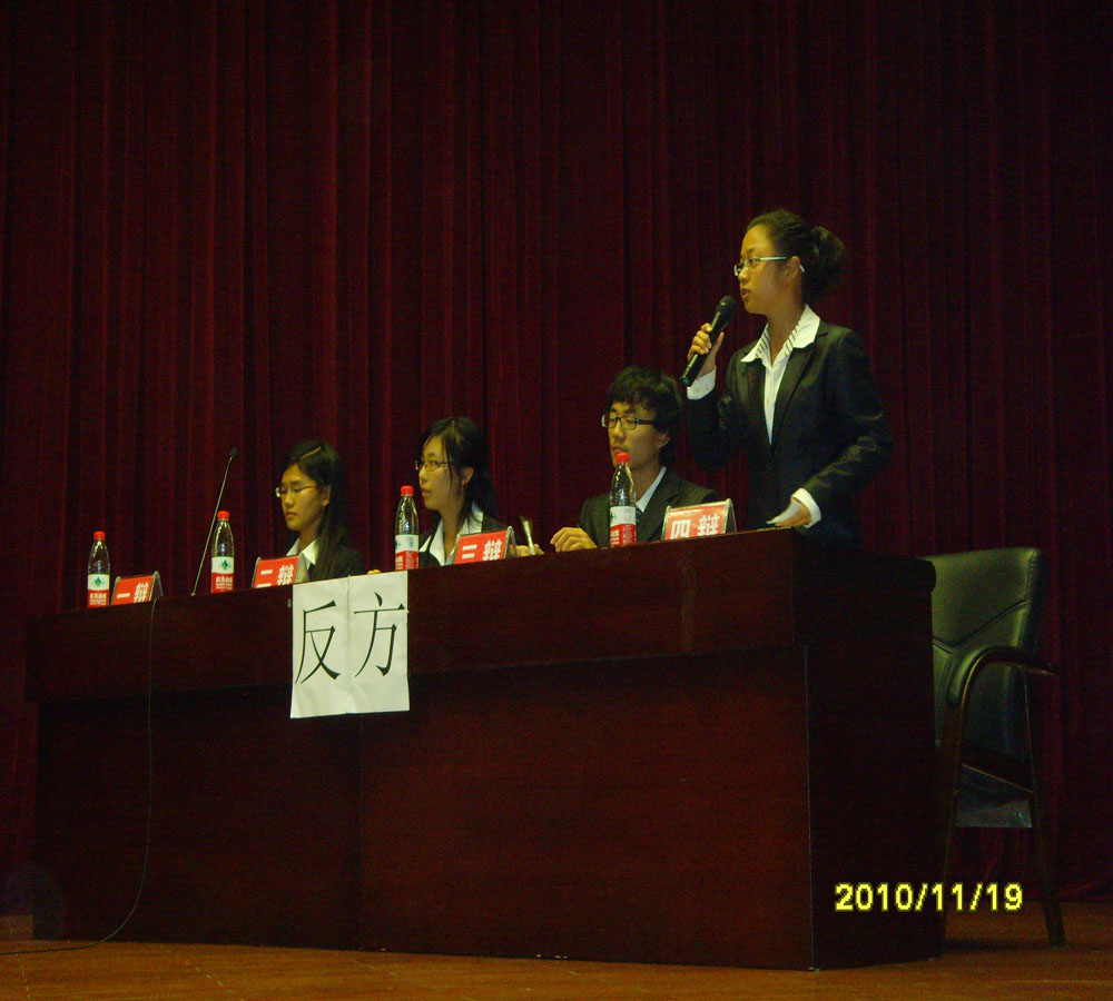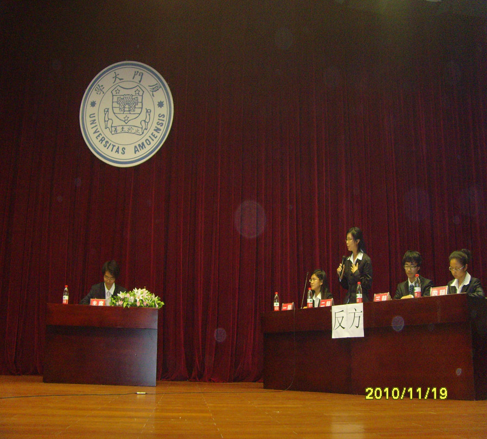 11月19日晚7点,由校区团工委主办、辩论学社承办的第七届厦门大学“新生杯”辩论赛在校区3号楼大报告厅开战。由我院10级新生郑鹊、周玉晶、韩乔、谭芮雨同学组成的代表队在揭幕战中发挥出色,战胜传统强队法学院代表队。