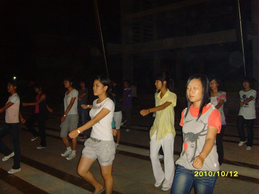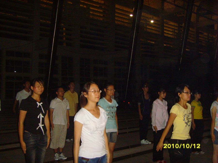10月11日晚九点,9001cc金沙参加广播操的同学在风雨球馆南门进行了第一次训练。09级学生代表姜冲、王志雄、叶芸、侯威、刘玉婷等到场指导10级同学训练。