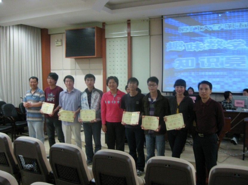 由9001cc金沙、信息与技术科学学院、软件学院主办的数学趣味知识竞赛决赛于五月九号晚七点举行,本次比赛经历了各院内部的选拔赛,两场预赛,经过激烈的角逐,最终由来自化学化工、信息科学与技术、海洋与环境、数学科学、管理、软件等六院代表队进入决赛阶段,经过必答题、选答题、猜词、抢答环节,最终决出第一名信息科学与技术——300分,第二名数学科学——280分,第三名化学化工——230分,第四名软件——220分,第五名海洋与环境、管理——210分,我院派出了陈继勇、成灵妍、欧剑宇这对组合,同时还勇得决赛第二名,猜词环节的第一名的好成绩。