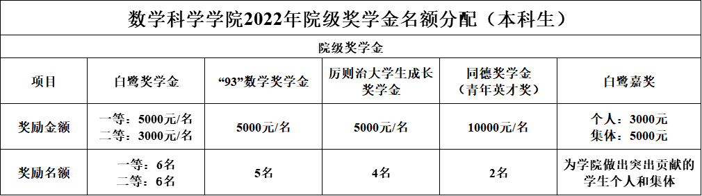 2022年校庆期间学院将评选颁发“白鹭奖学金”、“93数学奖学金”、“厉则治大学生成长奖学金”、“同德奖学金”等多项院级奖学金,现将评奖评优工作的有关事项通知如下:
